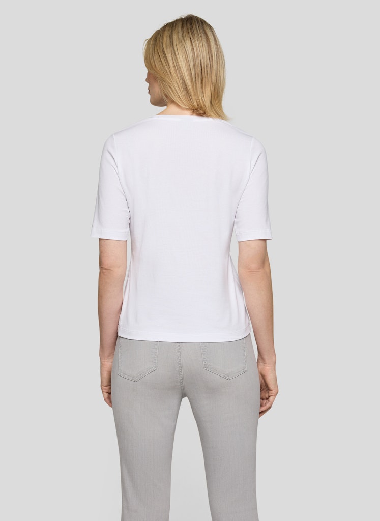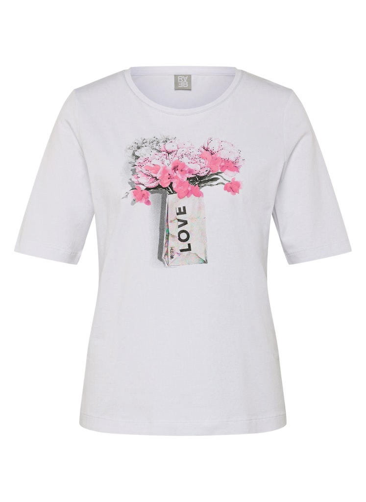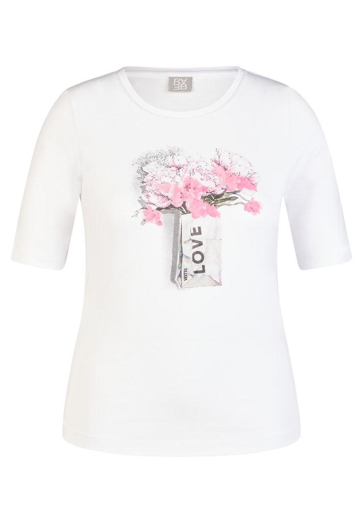 Gefertigt aus 95 % Baumwolle und 5 % Elasthan überzeugt dieses T-Shirt mit einem weichen Griff und angenehmem Stretchkomfort. Der klassische Rundhalsausschnitt sorgt für eine zeitlose Optik. Das florale Frontmotiv wird durch feine Strassdetails ergänzt und erhält dadurch eine dezente, funkelnde Note _ ideal für feminine Alltags-Styles mit besonderem Akzent. Baumwollmix mit Stretch. Weiches, angenehmes Tragegefühl. Klassischer Rundhalsausschnitt. Florales Motiv mit Strass. Pflegeleicht und formstabil.