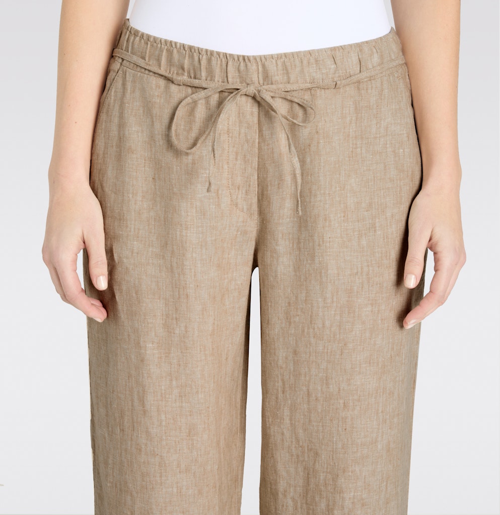 Wide Fit, Wide Leg, weites, gerades Bein, mittlere Leibhöhe, elastischer Bund, Jump-In-Modell, seitliche Eingrifftaschen vorne, aufgesetzte Taschen hinten, feiner Bindegürtel aus Stoff, Pure Linen, hochwertige, sommerliche Naturfaser-Qualität aus reinem Leinen, leicht im Gewicht, lässig-elegante Optik, temperaturausgleichend und angenehm kühl auf der Haut, hoher Tragekomfort, Das Model ist 1,75m groß und trägt die MAC Hosengröße 36, Fußweite bei Größe 36: 52cm