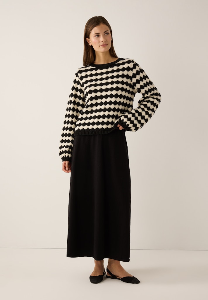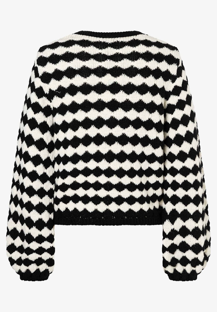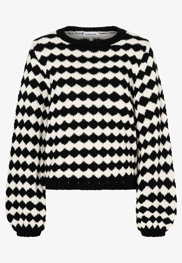 Der stilvolle Strickpullover von MORE & MORE begeistert mit seinem markanten Schwarz-Weiß-Muster aus rautenförmigen Streifen, das ihm eine moderne und zugleich zeitlose Ausstrahlung verleiht. Der lockere Schnitt mit den voluminösen Ärmeln sorgt für einen hohen Komfort, während die softe Strickqualität angenehm warm hält. Ein besonderes Key-Piece, das jeden Look mühelos aufwertet.