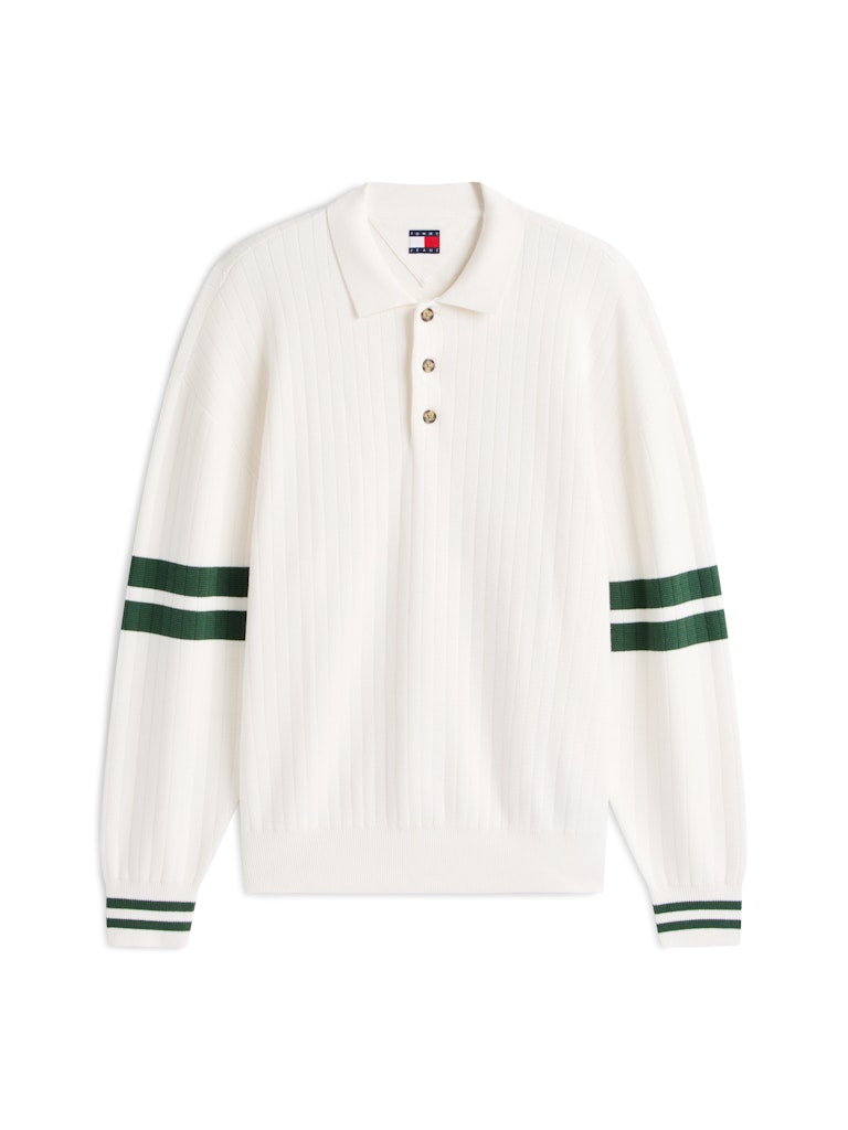 Bring a dose of preppy charm to smart-casual dressing with this knitted cotton jumper, featuring a polo collar and vintage-inspired stripe-detail sleeves.Highlights