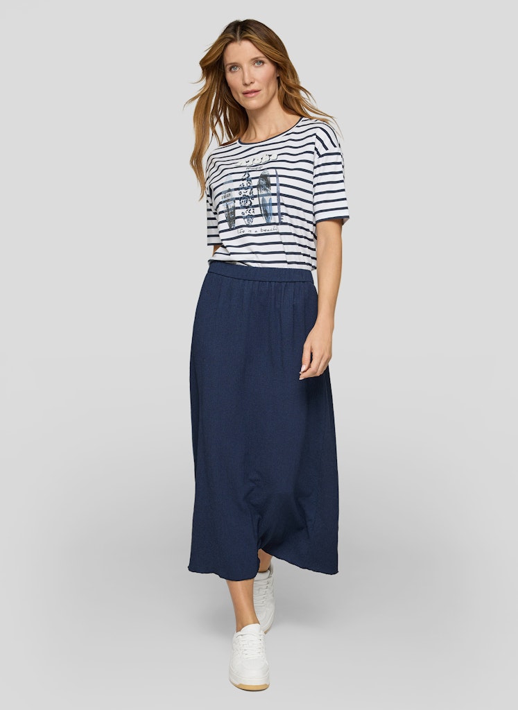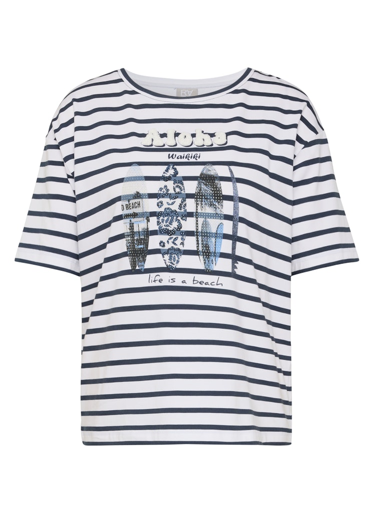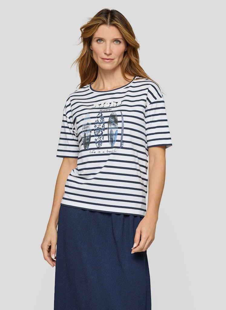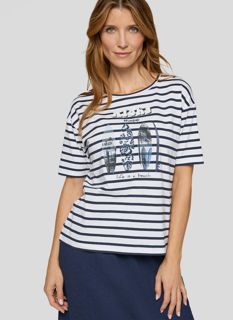 Das sommerliche Frontmotiv wird durch feine Strassdetails und glänzende Elemente akzentuiert und zieht dezent die Blicke auf sich. Das klassische Streifenmuster verleiht dem Shirt eine maritime Note. Die gerade, komfortable Passform eignet sich für vielseitige Kombinationen im Alltag. Rundhalsausschnitt und kurze Ärmel runden den unkomplizierten Stil ab. Baumwollmix mit Stretch. Streifenmuster. Frontprint mit Strass. Rundhalsausschnitt. Gerade Passform.
