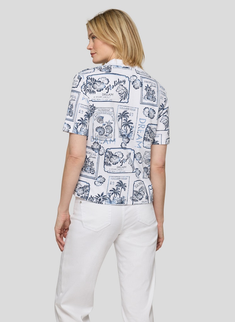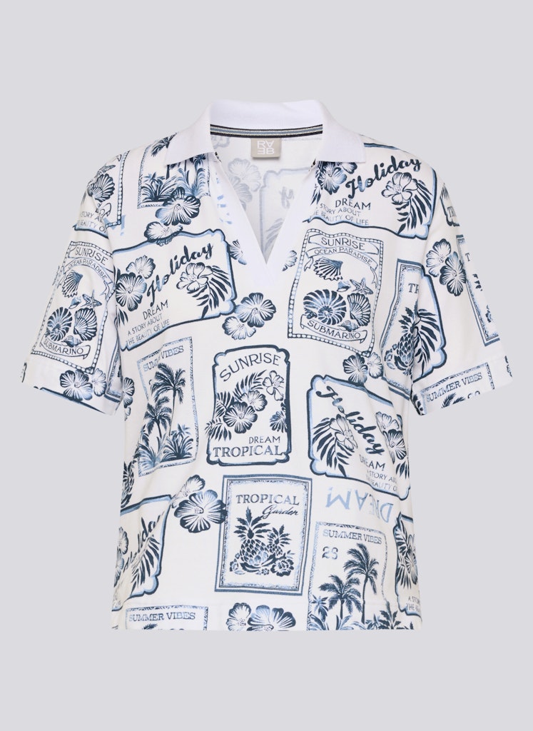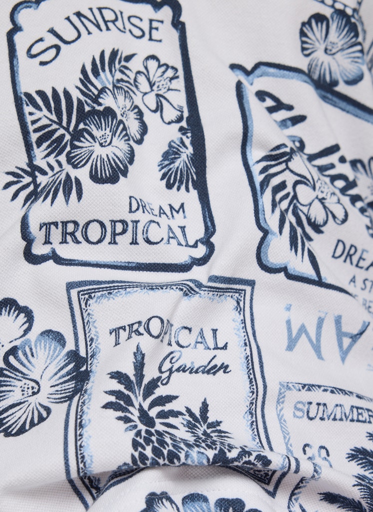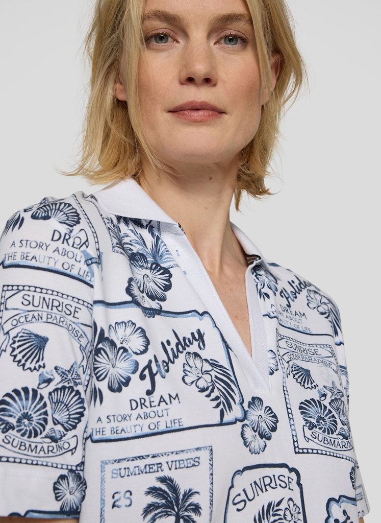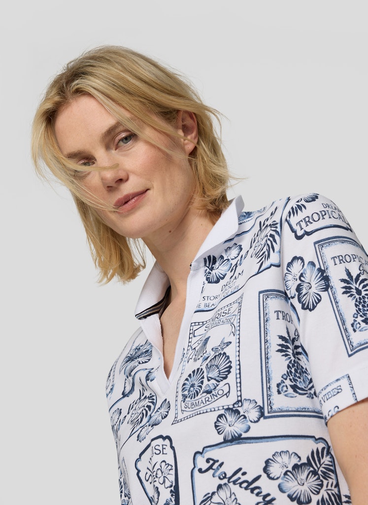 Der dekorative Allover-Print verleiht diesem Poloshirt eine frische, sommerliche Ausstrahlung. Der klassische Polokragen mit V-Ausschnitt sorgt für eine sportive Note und lockert das Design zugleich auf. Die bequeme, gerade Form trägt sich angenehm im Alltag und lässt sich vielseitig kombinieren. Kurze Ärmel runden den lässigen Stil ab. Baumwollmix mit Stretch. Polokragen mit V-Ausschnitt. Halbarm. Sommerlicher Allover-Print. Gerade Passform.