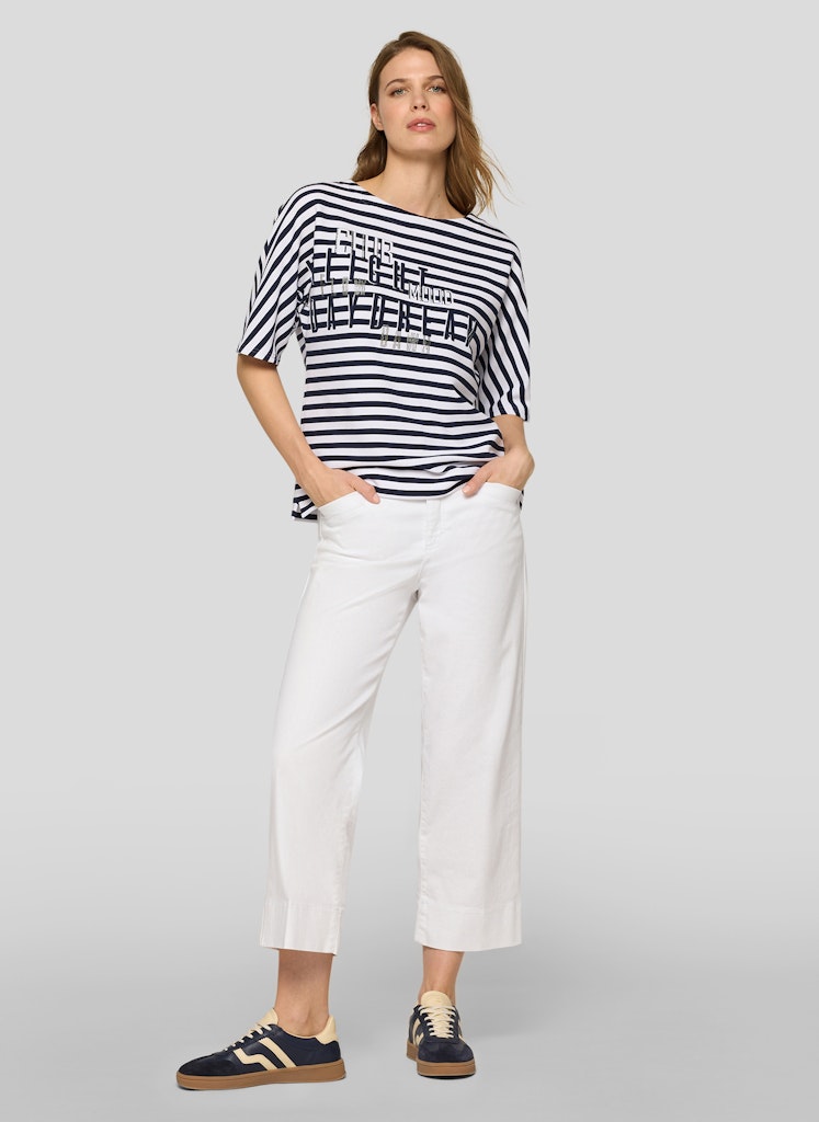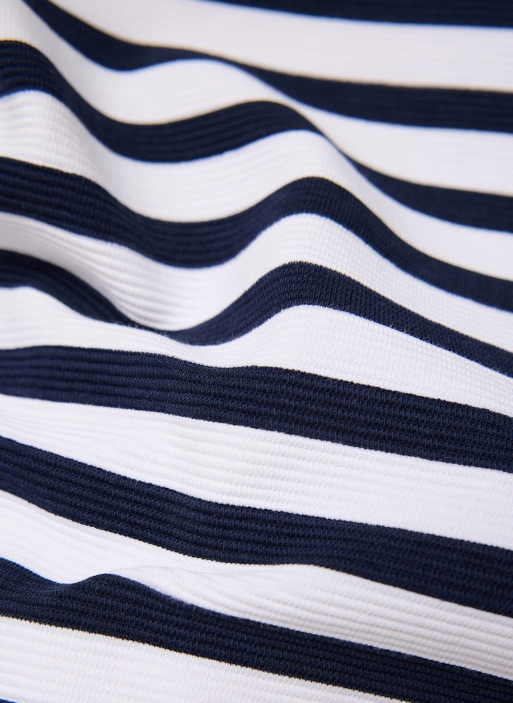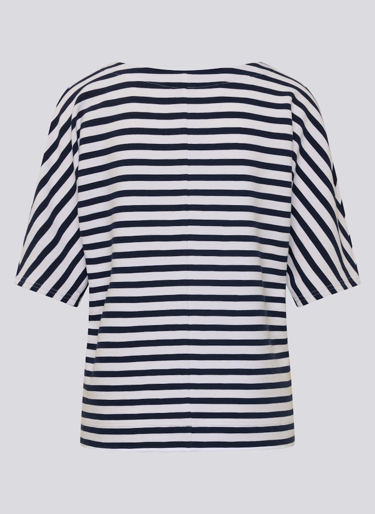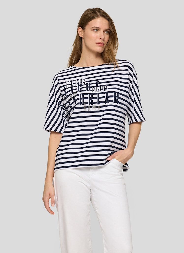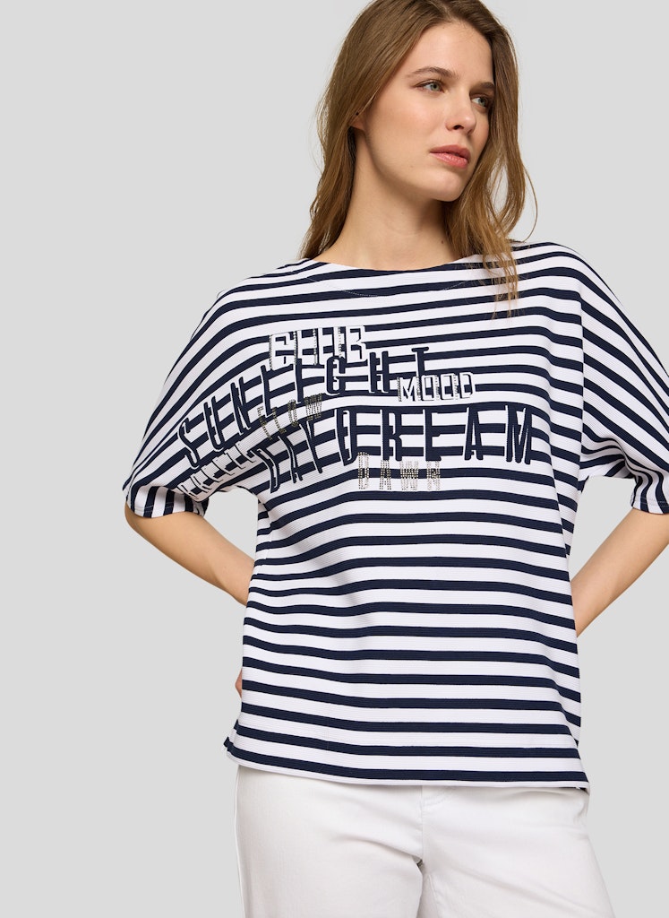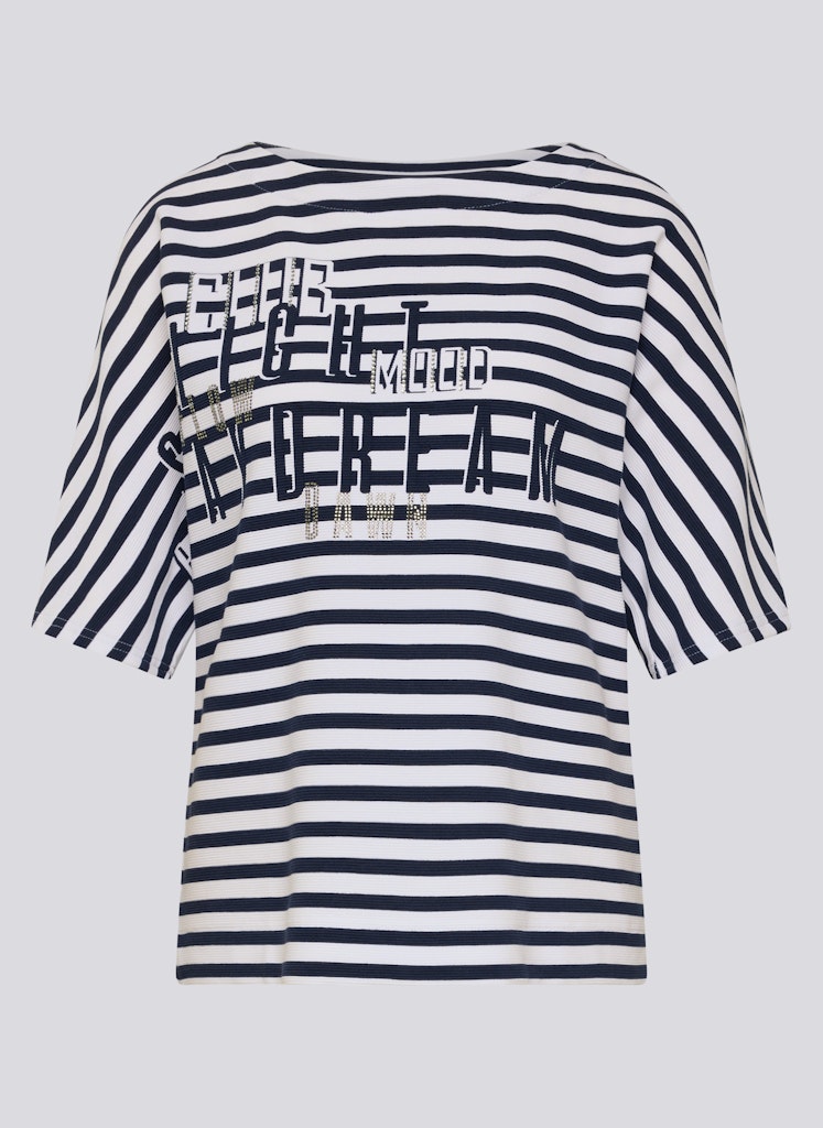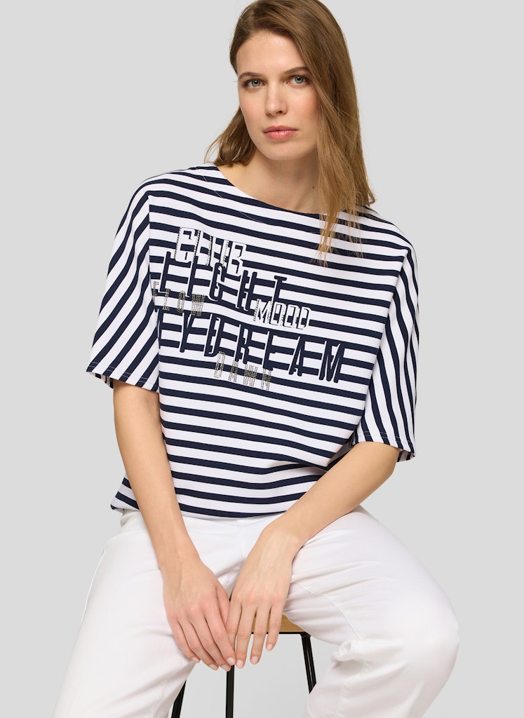 Das markante Frontmotiv wird durch funkelnde Strasssteine wirkungsvoll hervorgehoben und setzt einen modischen Akzent. Das klassische Streifenmuster verleiht dem Shirt eine maritime Note, während die strukturierte Rippqualität für eine lebendige Oberfläche sorgt. Die lockere Form mit überschnittenen Schultern trägt sich angenehm und wirkt entspannt im Alltag. Baumwollmix mit Stretch. Streifenmuster in Rippoptik. Strassverziertes Frontmotiv. Halbarm mit überschnittener Schulter. Locker fallende Form.