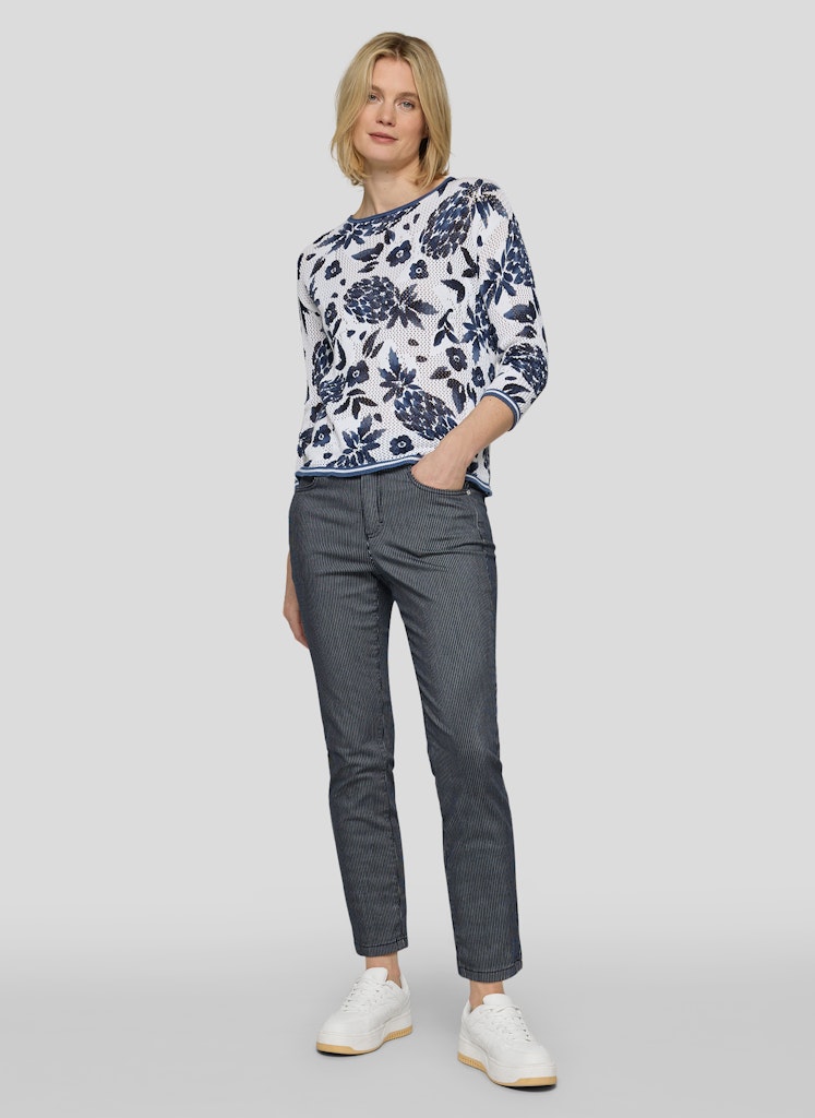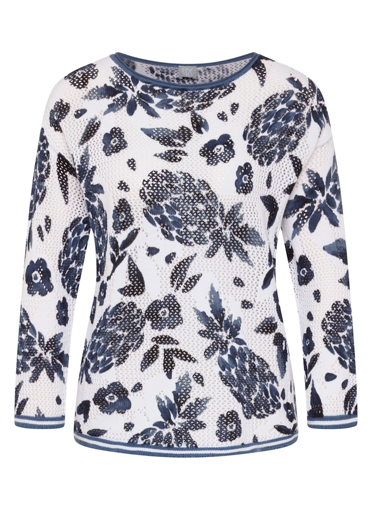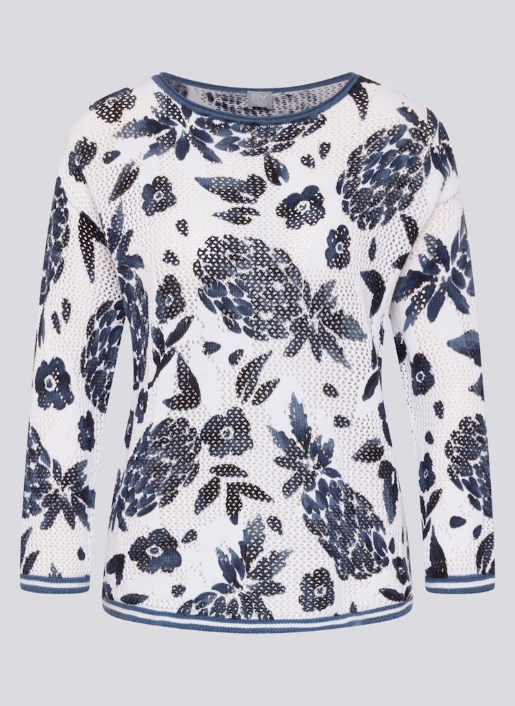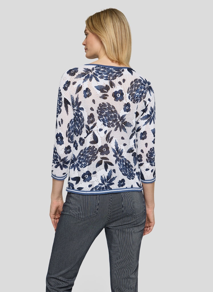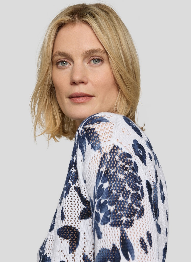 Die feine Lochstruktur verleiht diesem Strickshirt eine luftige, lebendige Oberfläche. Florale Motive setzen einen dekorativen Akzent und unterstreichen den sommerlichen Charakter. Der klassische Rundhalsausschnitt und die 3/4-Ärmel sorgen für eine zeitlose, unkomplizierte Optik. Die leichte Baumwollqualität trägt sich angenehm und eignet sich ideal für warme Tage. Reine Baumwolle. Luftige Lochstruktur. Floraler Allover-Print. Rundhalsausschnitt. 3/4-Ärmel.