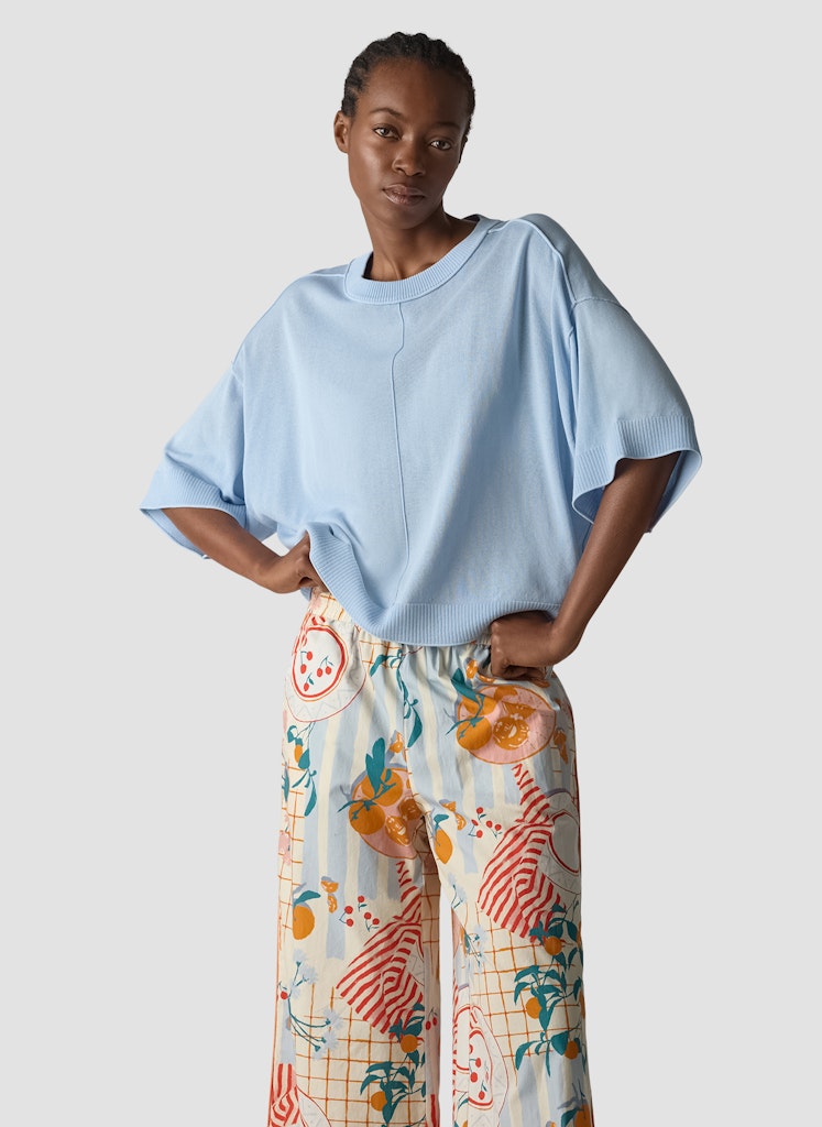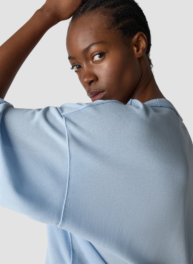 Die entspannte Silhouette verleiht diesem Pullover eine moderne, lässige Ausstrahlung. Breite Fledermausärmel mit strukturierten Bündchen setzen einen markanten Akzent. Eine sichtbare Naht auf der Vorderseite unterstreicht den puristischen Look. Der Rundhalsausschnitt ergänzt das Design, während der Baumwollmix für angenehmen Tragekomfort sorgt. Baumwollmix. Fledermausärmel. Strukturierte Bündchen. Rundhalsausschnitt. Markante Frontnaht.