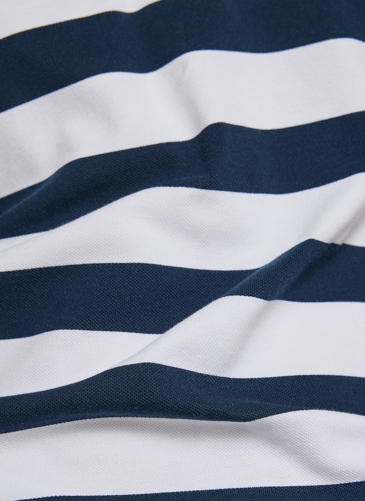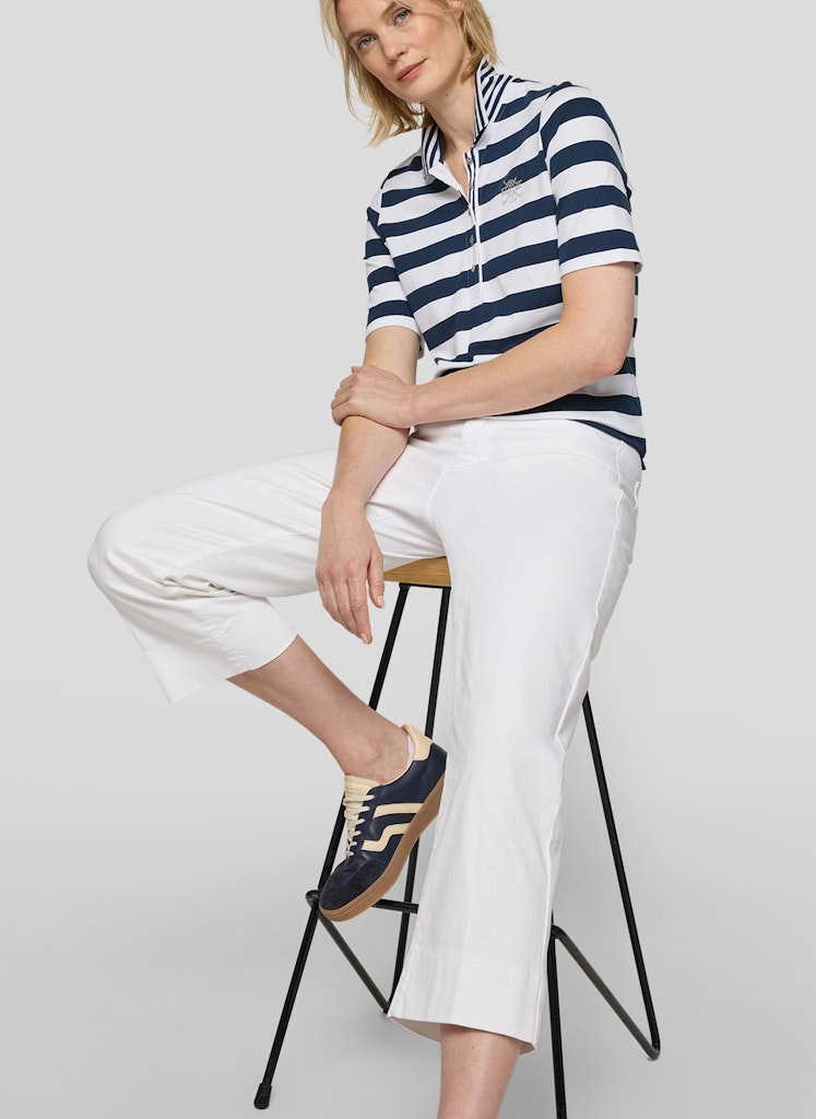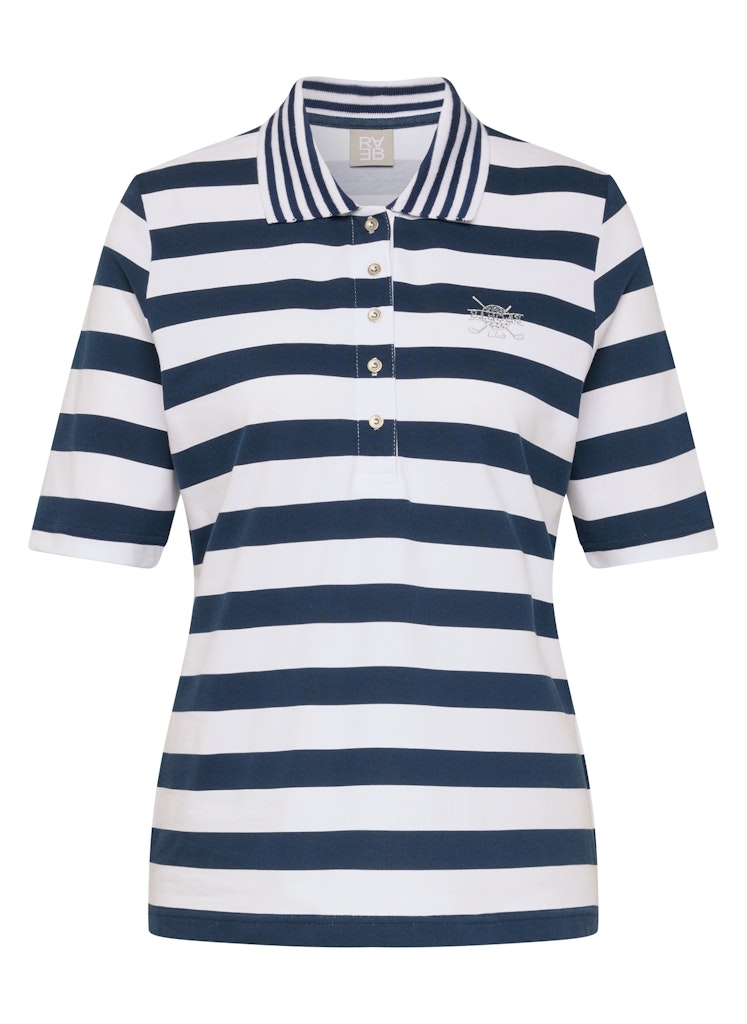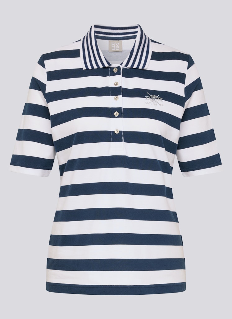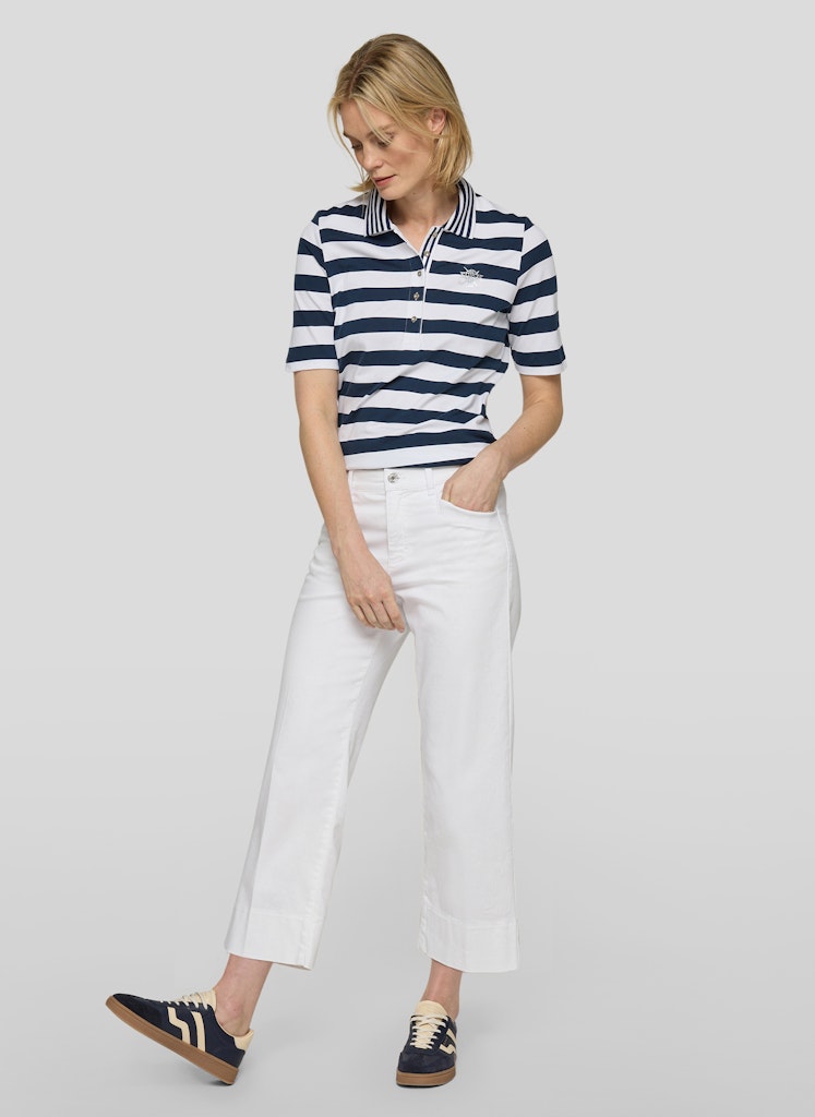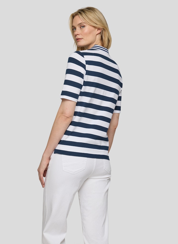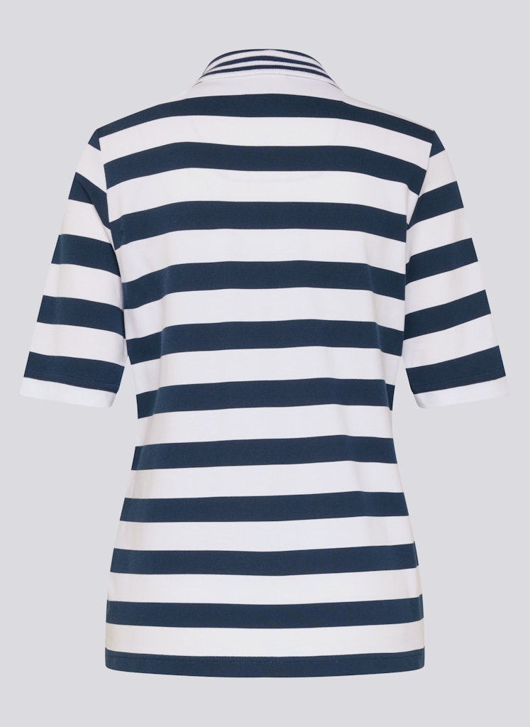Die breiten Streifen verleihen dem Poloshirt eine klare, maritime Ausstrahlung. Ein klassischer Polokragen mit kurzer Knopfleiste unterstreicht den sportiven Charakter. Auf der Brust setzt ein kleines Strassmotiv einen dezenten, funkelnden Akzent. Die leicht taillierte Form sitzt bequem und wirkt zugleich feminin. Der elastische Baumwollmix sorgt für angenehmen Tragekomfort. Baumwollmix mit Stretch. Breites Streifenmuster. Polokragen mit Knopfleiste. Strassmotiv auf der Brust. Leicht taillierte Form.