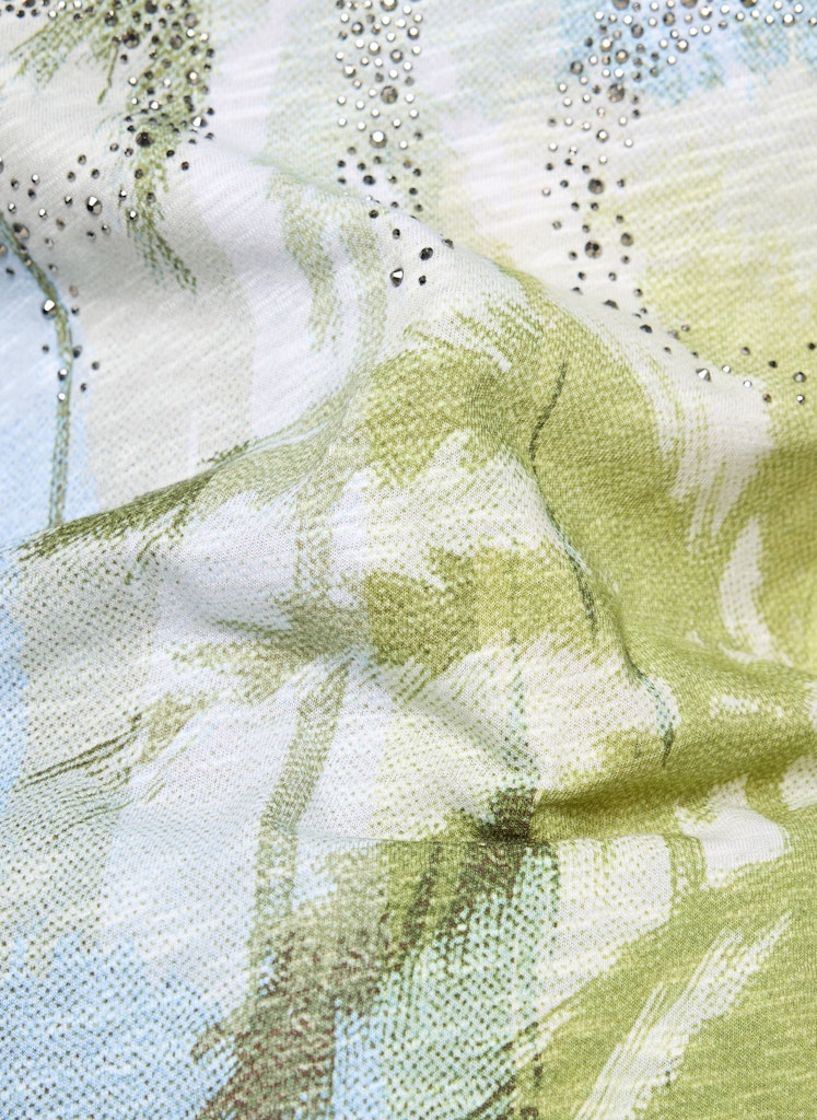Der sommerliche Palmenprint verleiht diesem Shirt eine frische, lebendige Ausstrahlung. Funkelnde Strassdetails setzen im Vorderteil dekorative Akzente und unterstreichen das Motiv. Die locker fallende Form wirkt entspannt und lässt sich vielseitig kombinieren. Kurze Ärmel und der weiche Baumwoll-Modal-Mix sorgen für angenehmen Tragekomfort. Baumwoll-Modal-Mix.Palmen-Allover-Print. Strassdetails im Vorderteil. Halbarm. Locker fallende Form.