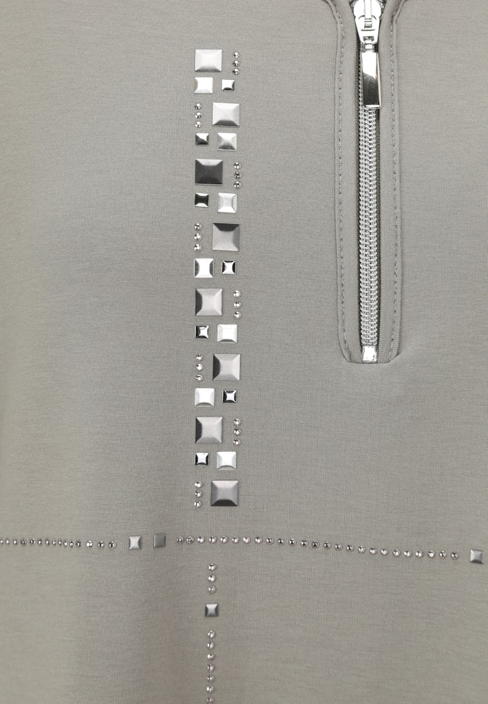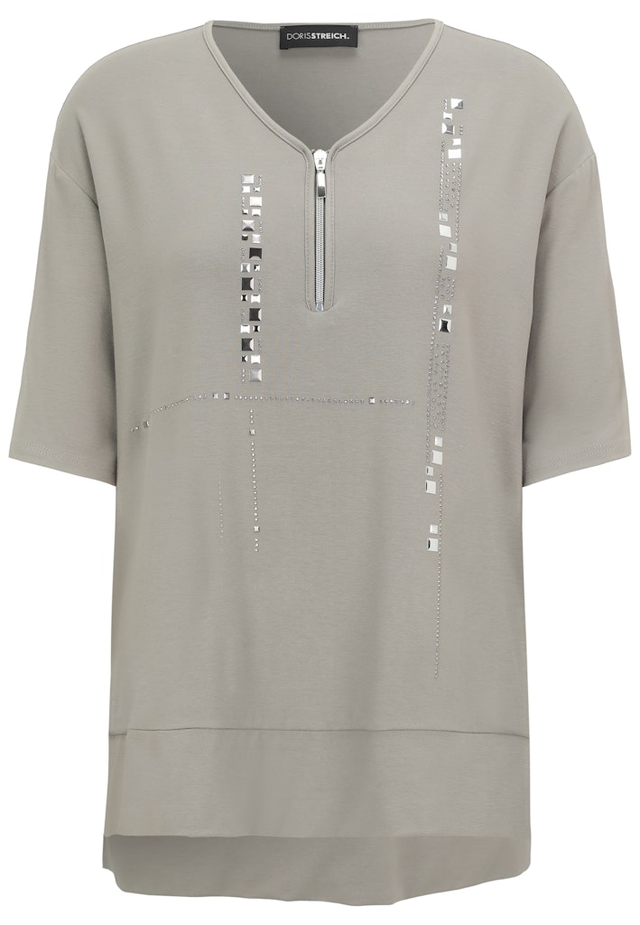 Das lässig überschnittene Long-Shirt von Doris Streich ist ein Hingucker: Das edle silberfarbene Motiv aus Metallplättchen und der Zipper rundet den edlen Look ab. Die angesagte High-Low-Form mit verlängerter Rückenpartie unterstreicht den lässigen Look.