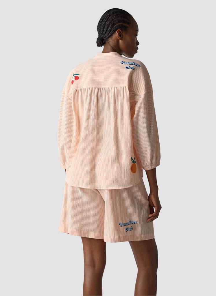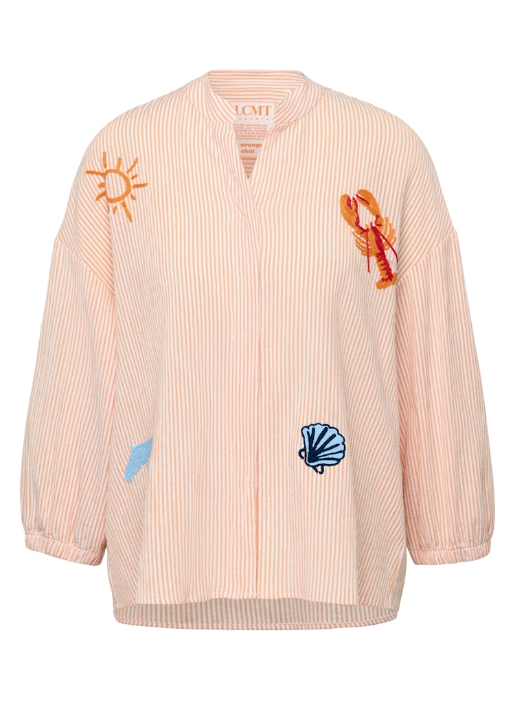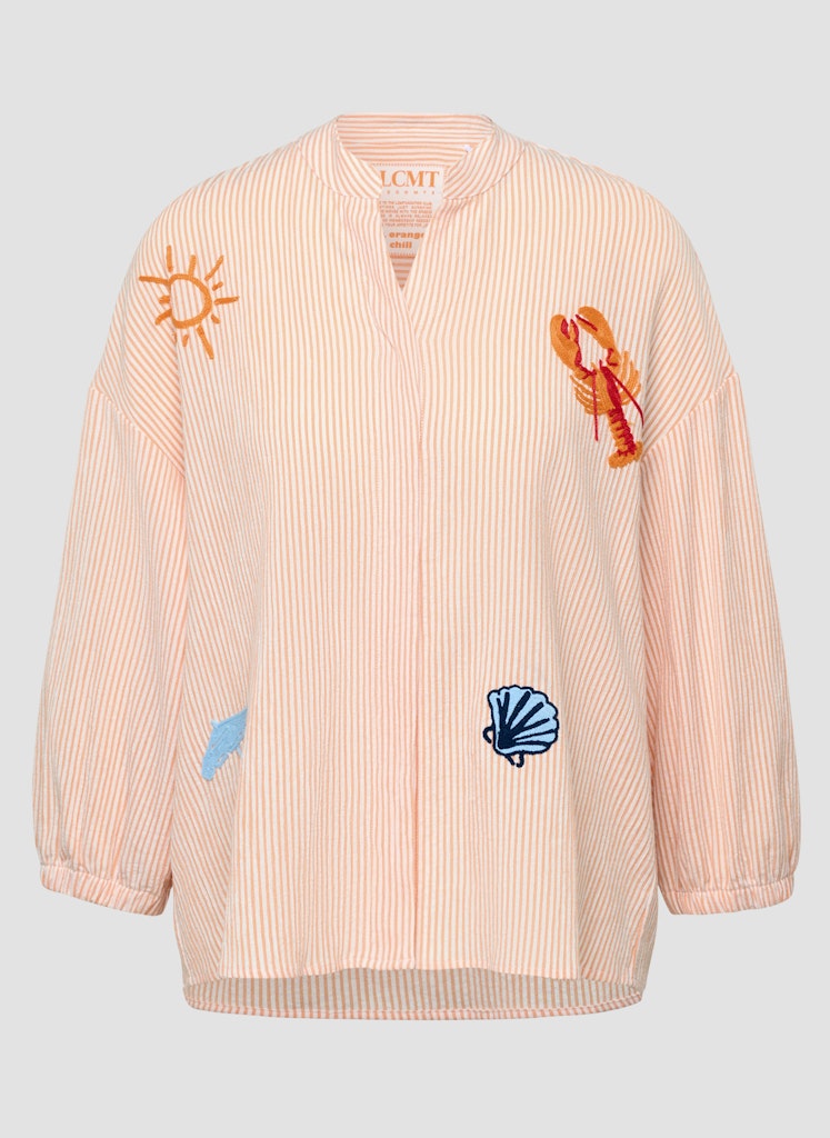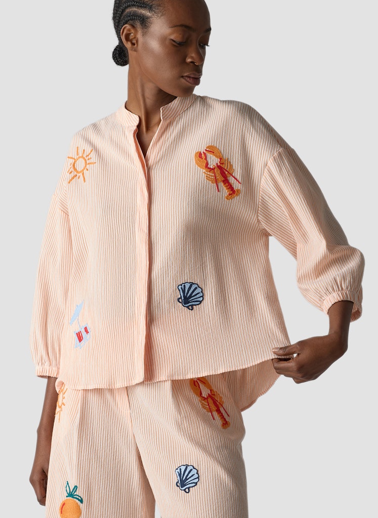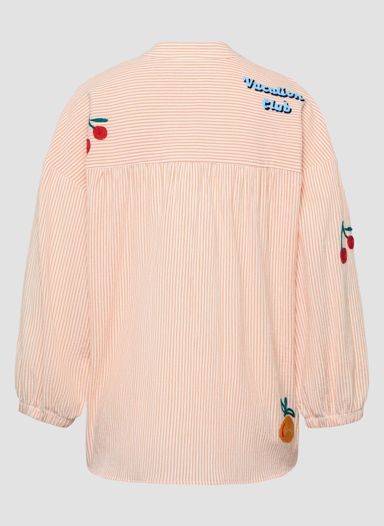 Die feine Streifenstruktur verleiht dieser Bluse eine lebendige Oberfläche. Verspielte Stickereien setzen farbige Akzente und unterstreichen den sommerlichen Charakter. Der kleine Stehkragen mit kurzer Knopfleiste sorgt für eine moderne Note, während die lockere Passform und die Ärmel mit elastischem Abschluss angenehm zu tragen sind. Ein leichter Materialmix rundet das Modell ab. Feine Streifenstruktur. Dekorative Stickereien. Stehkragen mit kurzer Leiste. Locker fallende Form. Polyester-Baumwoll-Mix.
