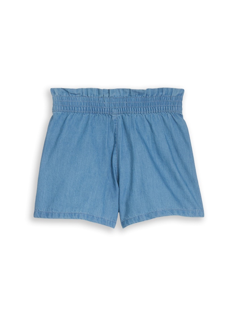 Jeansshorts in Denim-Optik mit gerafftem Hosenbund und seitlichen Eingriffstaschen vorne. Aus einem strukturierten Baumwollstoff für hohe Strapazierfähigkeit. Mit Gürtelschlaufe und verstellbarem Gummizug mit Knopf im Hosenbund zum flexiblen Verstellen der Weite.