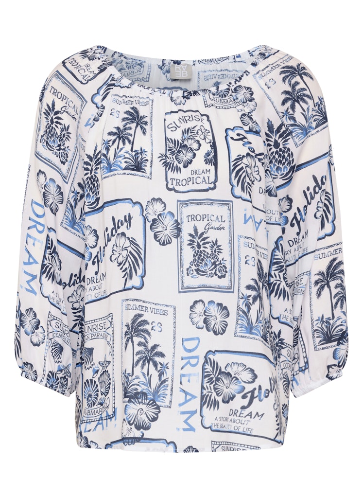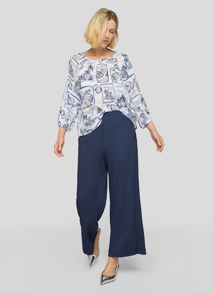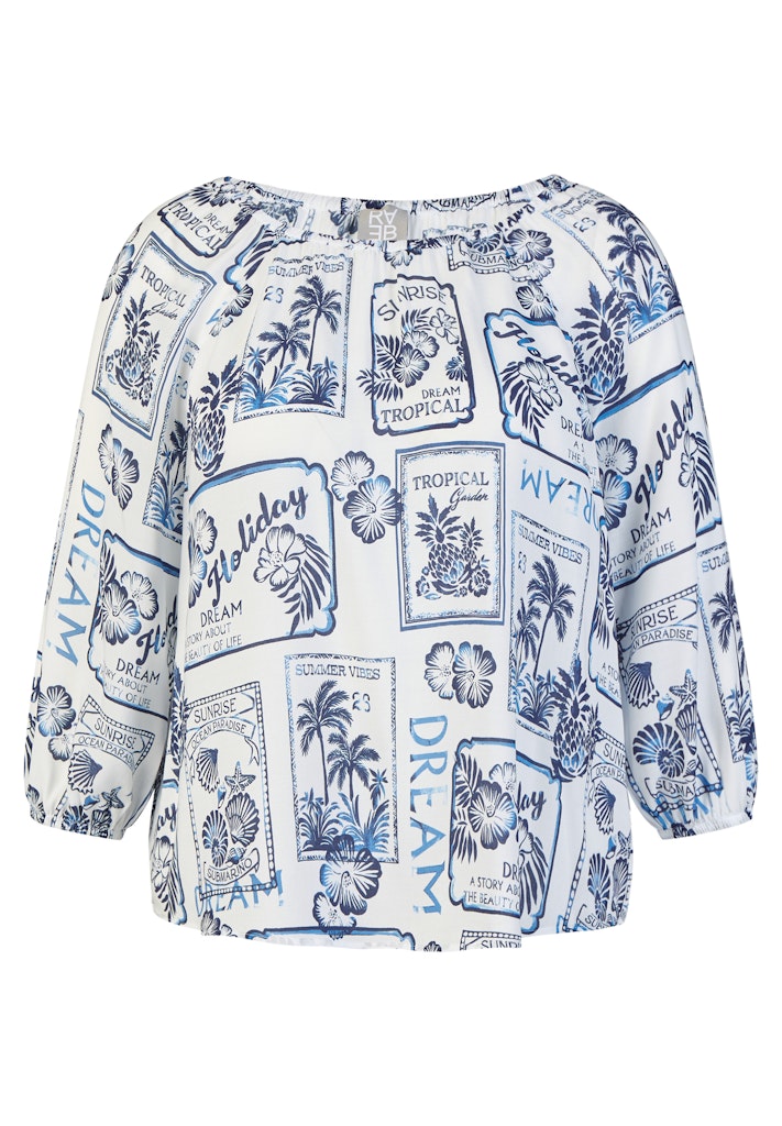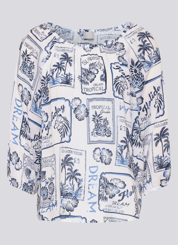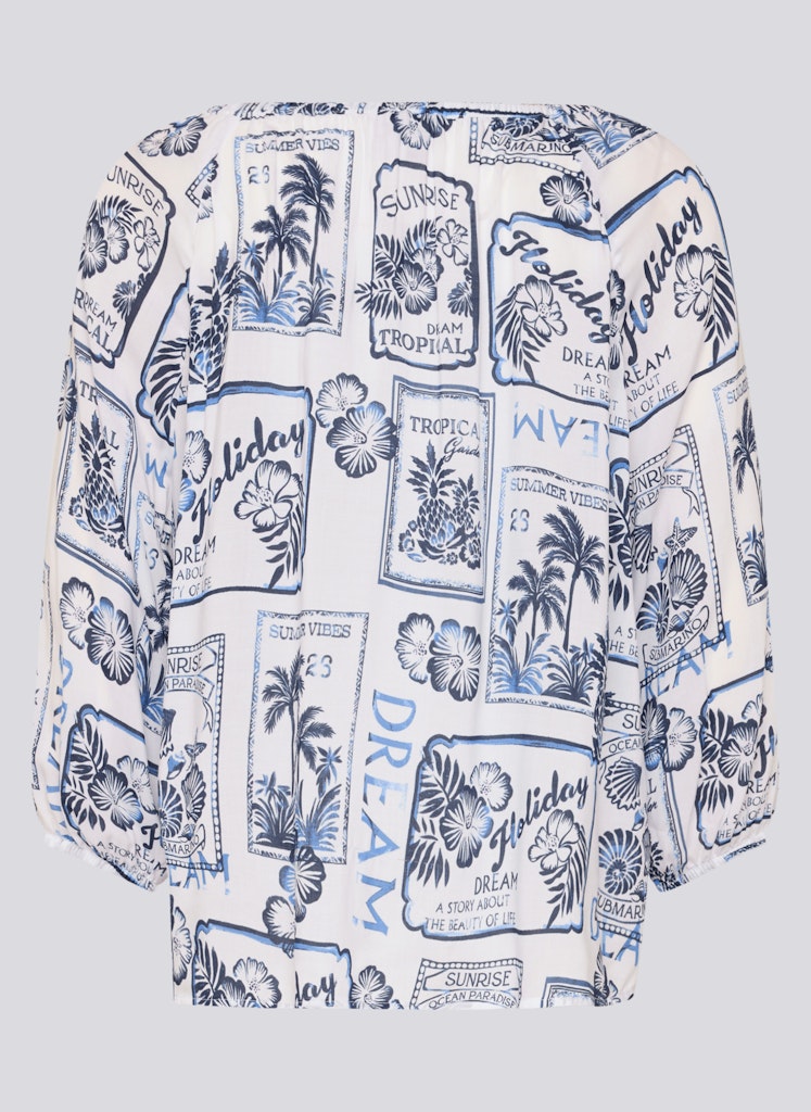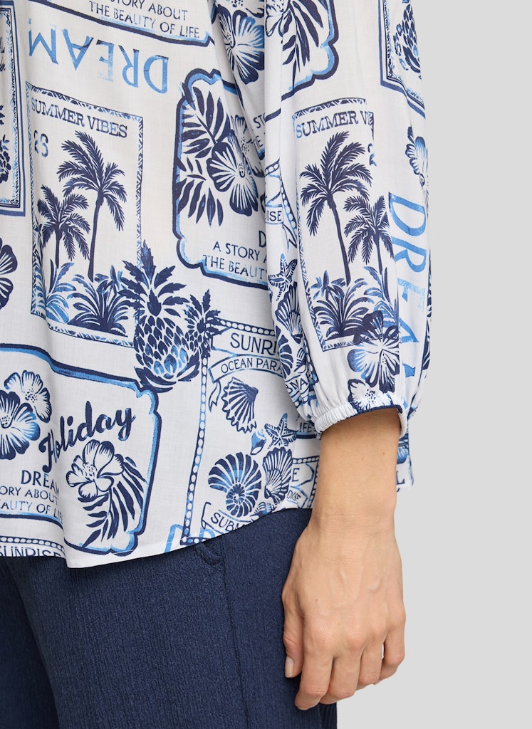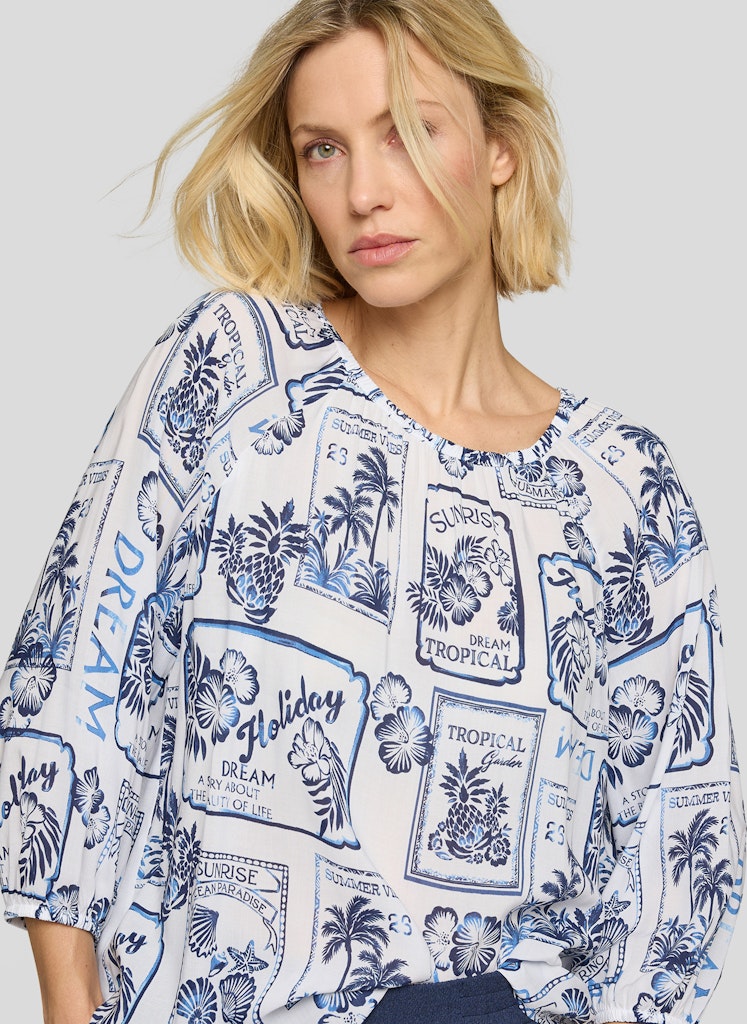 Die leichte Viskose verleiht dieser Bluse eine weich fließende Qualität und ein angenehmes Tragegefühl. Der Rundhalsausschnitt mit kleinem Schlitz setzt einen dezenten Akzent, während die lockere Passform für eine entspannte Silhouette sorgt. Die 3/4-Ärmel enden mit elastischen Bündchen und fallen leicht bauschig, was den luftigen Charakter unterstreicht. Der ausdrucksstarke Allover-Print macht das Modell zu einem vielseitigen Blickfang für Alltag und Freizeit. Reine Viskose mit weichem Fall. Locker geschnittene Form. Rundhalsausschnitt mit Schlitz. 3/4-Ärmel mit elastischem Abschluss. Luftig und angenehm zu tragen.