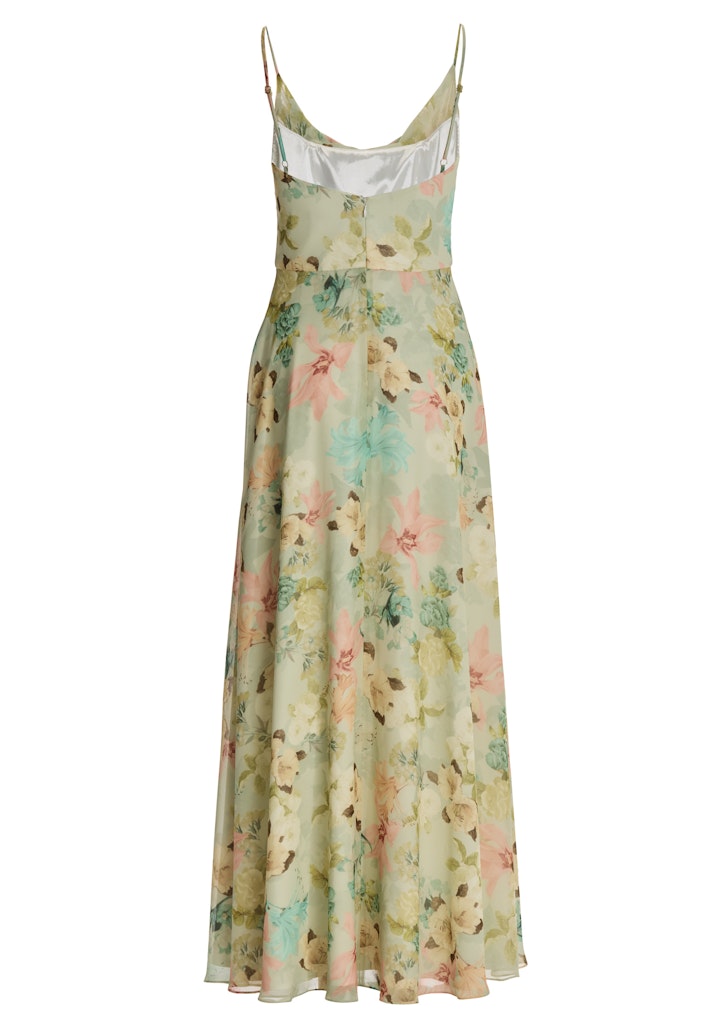 Abendkleid aus floral bedrucktem Chiffon mit Wasserfall-Ausschnitt und Beinschlitz