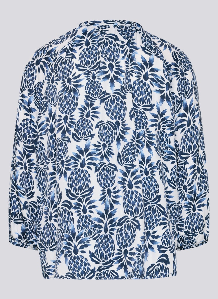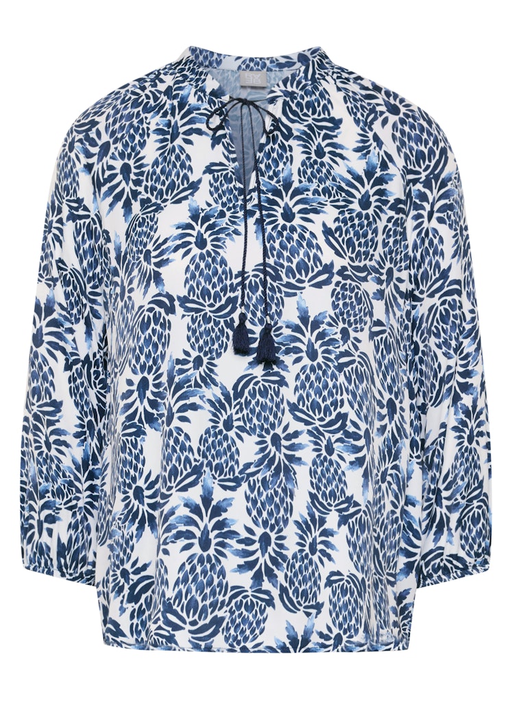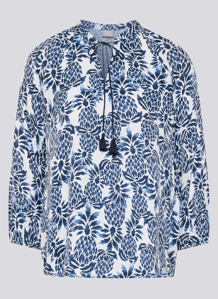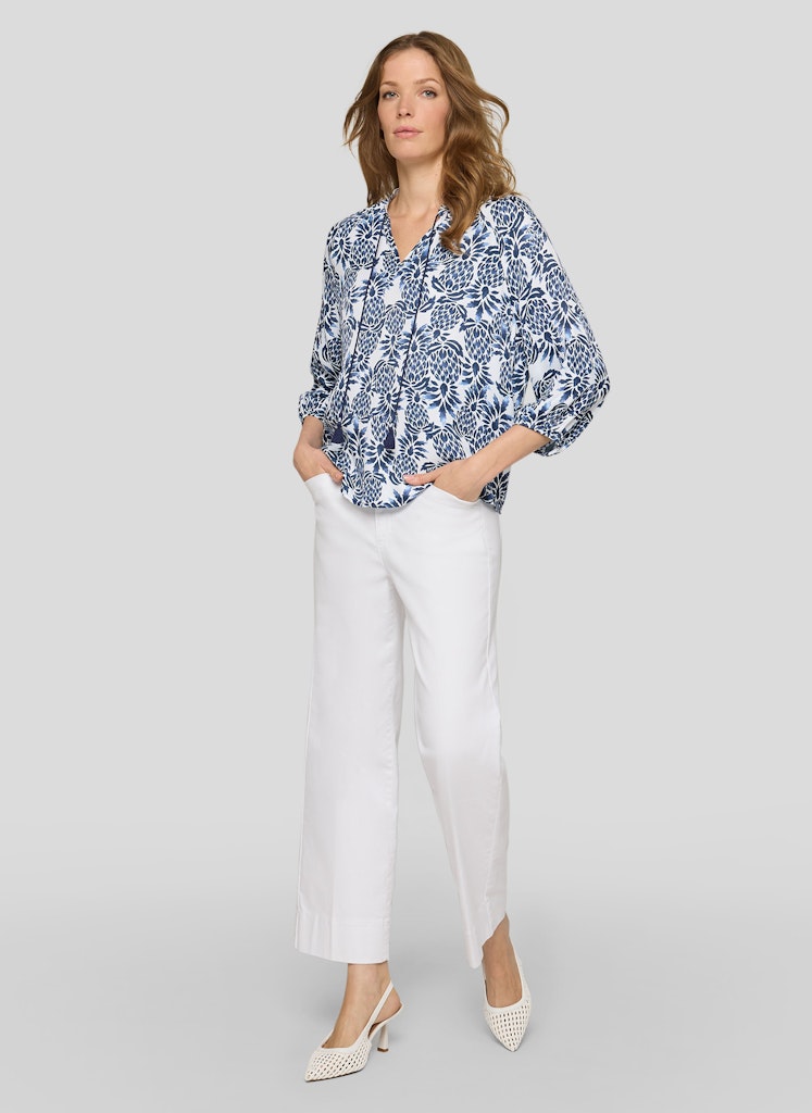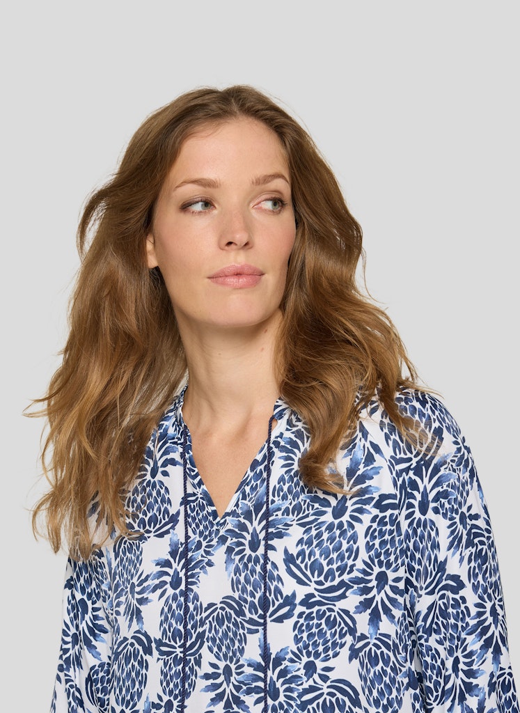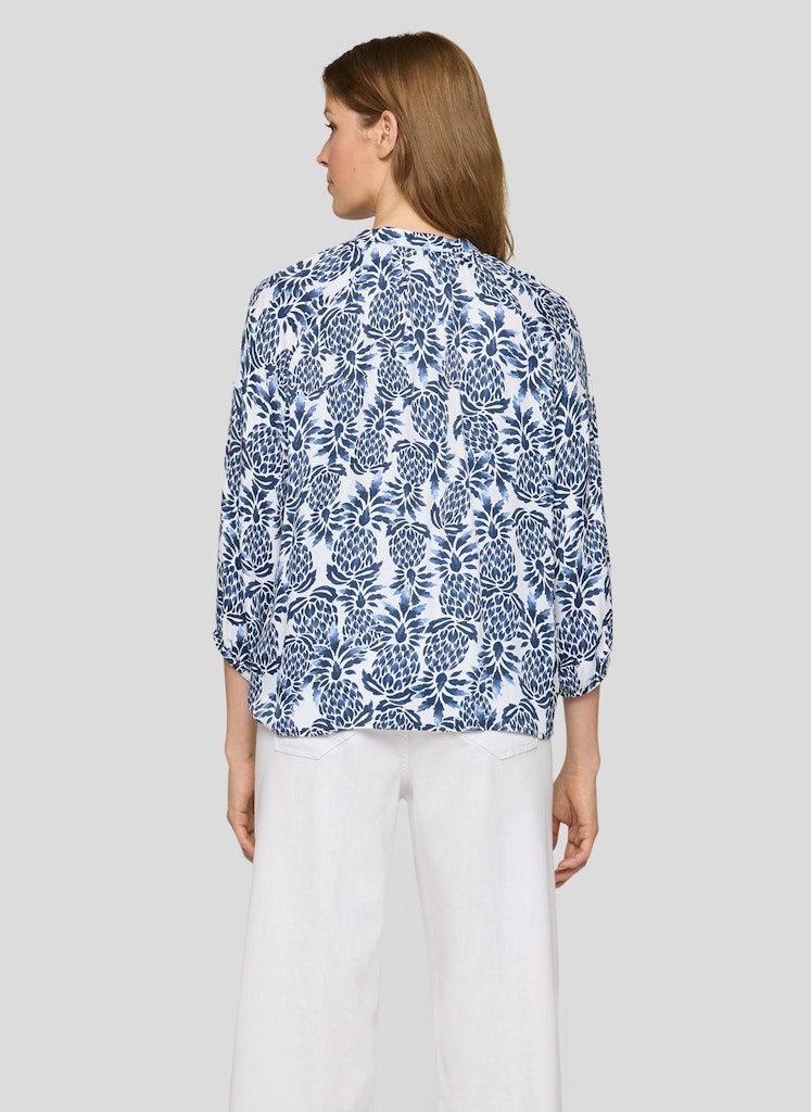 Die weich fließende Viskose verleiht dieser Bluse eine luftige, angenehme Qualität und sorgt für hohen Tragekomfort. Der kleine Stehkragen mit Schlitz und dekorativem Bindeband unterstreicht den femininen Charakter, während die lockere Passform eine entspannte Silhouette schafft. Die 3/4-Ärmel enden mit elastischen Bündchen und fallen leicht bauschig, was den legeren Stil zusätzlich betont. Ideal für vielseitige Kombinationen _ von casual bis gepflegt. Reine Viskose mit weichem Fall. Locker geschnittene Form. Stehkragen mit Bindeband. 3/4-Ärmel mit elastischem Abschluss. Luftig und angenehm zu tragen.