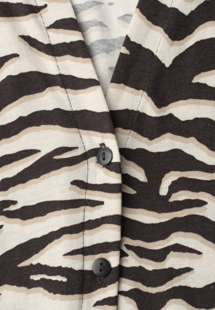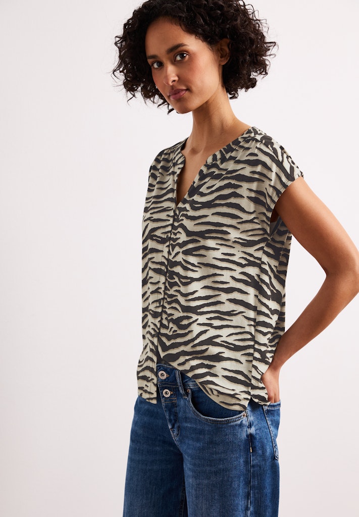 Das Shirt im Blusen-Look von Street One für Damen verbindet sommerliche Leichtigkeit mit dem angenehmen Tragegefühl eines Jerseyshirts. Das gemusterte Design verleiht dem Look eine feminine Ausstrahlung, während Split Neck und Knopfleiste stilvolle Akzente setzen. Dropped Shoulders und seitliche Schlitze sorgen für eine lockere Silhouette und hohen Komfort. Ideal für warme Tage, an denen Du Casual-Styles mit modischem Anspruch kombinieren möchtest. Jerseyshirt Casual Split Neck Dropped Shoulders Leicht und sommerlich Material: 50% Modal, 50% Baumwolle