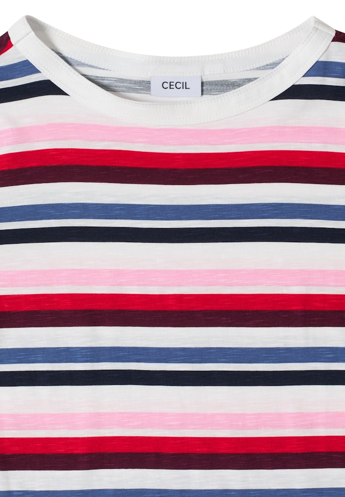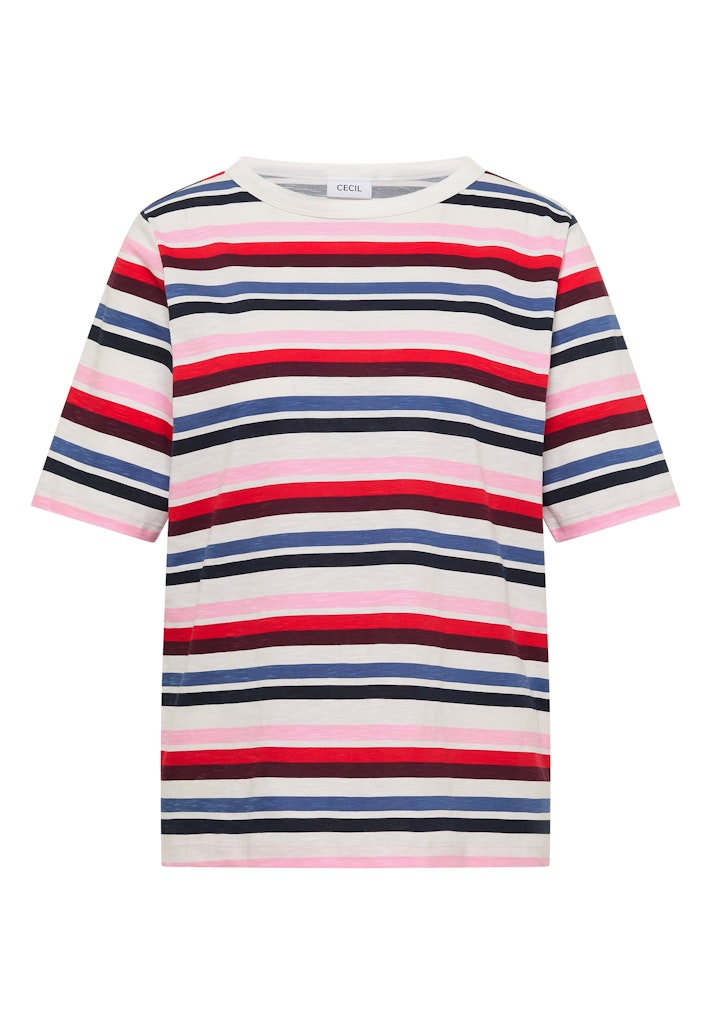 Das Multicolor Streifenshirt von CECIL für Damen setzt mit seinem modernen Streifenmuster frische Akzente. Der Rundhalsausschnitt und die kurzen Ärmel machen das Flammgarnshirt besonders alltagstauglich. Die reine Baumwolle fühlt sich angenehm auf der Haut an. Eine schöne Wahl für dich, wenn du Farbe und Komfort in deinem Casual-Outfit kombinieren möchtest. Flammgarnshirt Casual Rundhals Kurzarm Modernes Streifenmuster Material: 100% Baumwolle