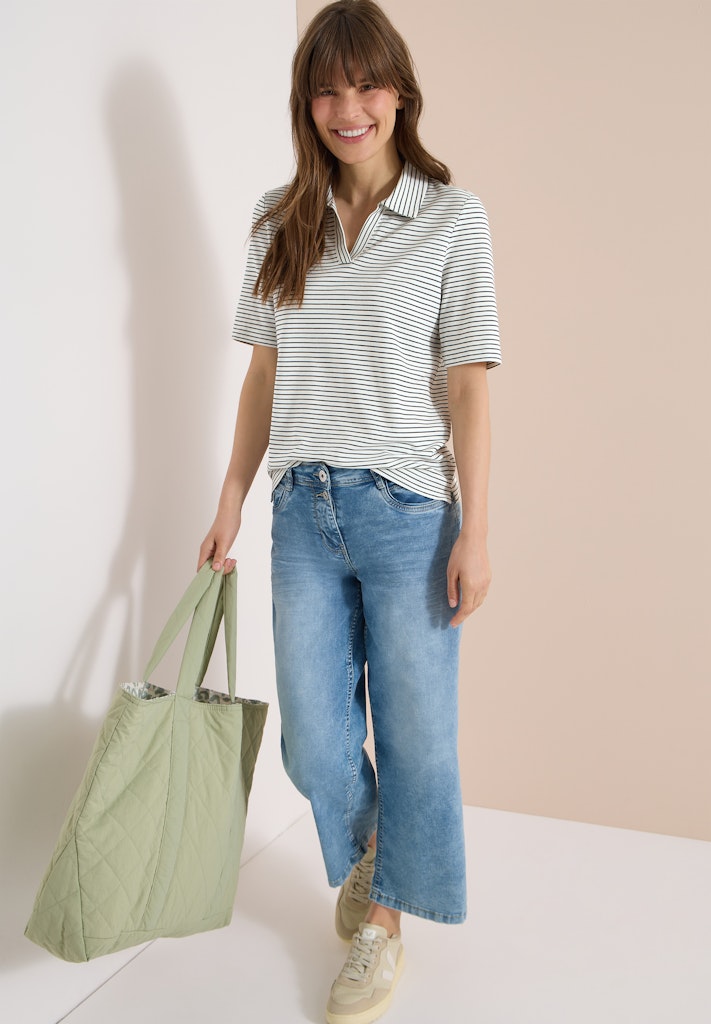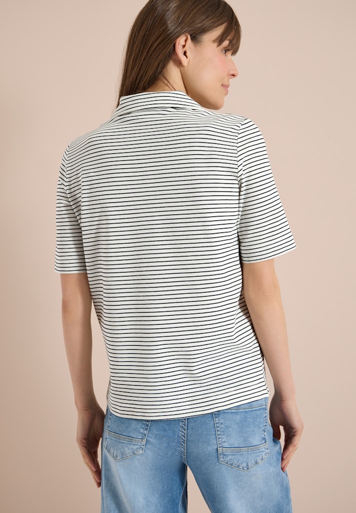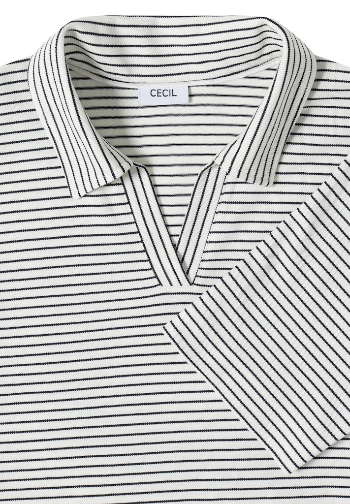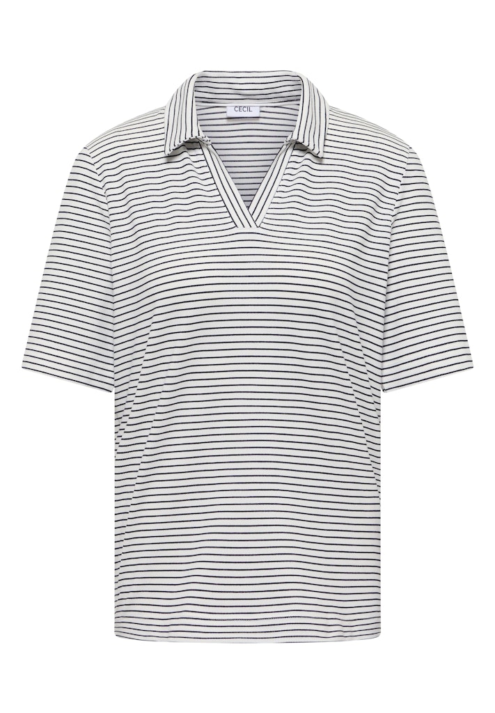 Das gestreifte Piqué Shirt von CECIL für Damen verbindet sportiven Stil mit moderner Vielseitigkeit. Der Polokragen und die kurzen Ärmel unterstreichen den lässig-sportiven Look, während das Streifenmuster für frische Akzente sorgt. Der softe Baumwoll-Modalmix mit Stretchanteil trägt sich angenehm und bietet hohen Tragekomfort. Ideal für dich, wenn du ein sportives Shirt suchst, das sich vielseitig kombinieren lässt. Piqué Shirt Sportiv Polokragen Kurzarm Modern und vielseitig Material: 48% Baumwolle, 48% Modal, 4% Elasthan