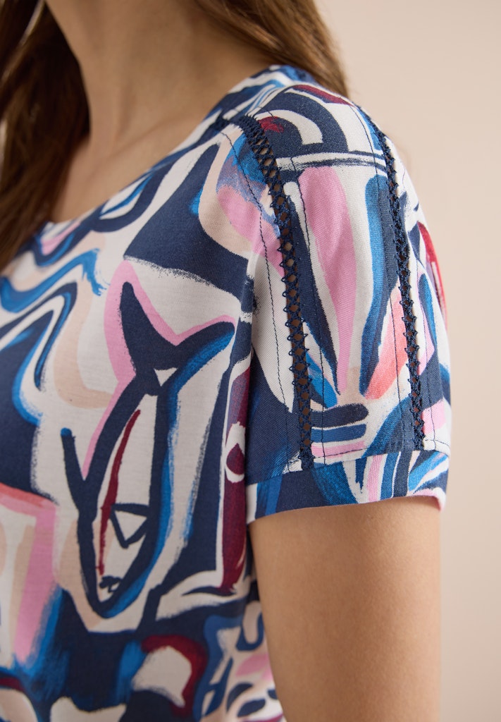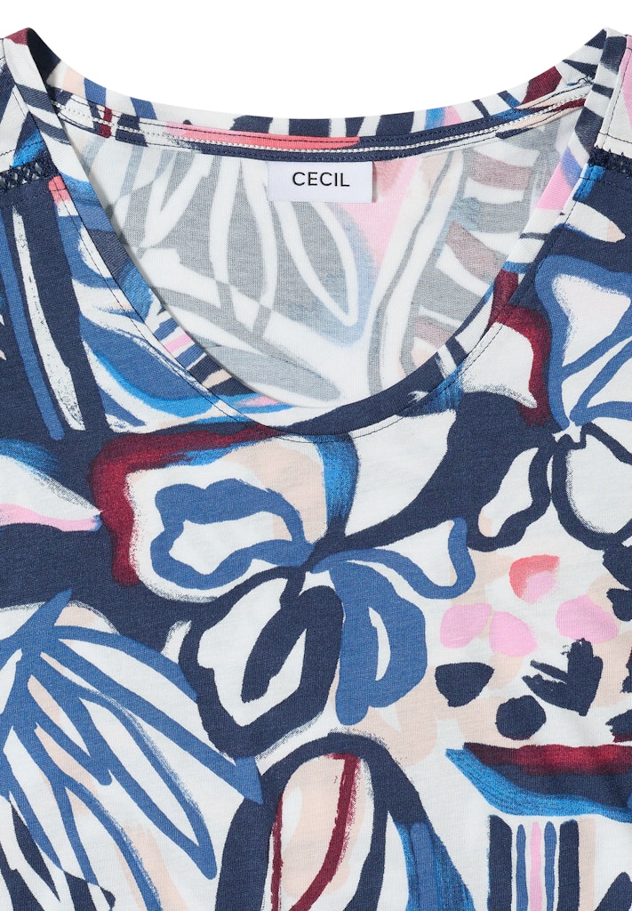 Dieses Jerseyshirt von CECIL für Damen begeistert mit einem maritim inspirierten Multicolor Print und liebevollen Details. Der gerundete V-Ausschnitt und die Spitzendetails an den Schultern setzen feminine Akzente. Der elastische Saum sorgt für einen bequemen Sitz und unterstreicht den lässigen Stil. Die weiche Baumwoll-Modalmix-Qualität trägt sich angenehm auf der Haut. Jerseyshirt Casual Gerundeter V-Ausschnitt Kurzarm Spitzendetail an den Schultern Material: 50% Modal, 50% Baumwolle