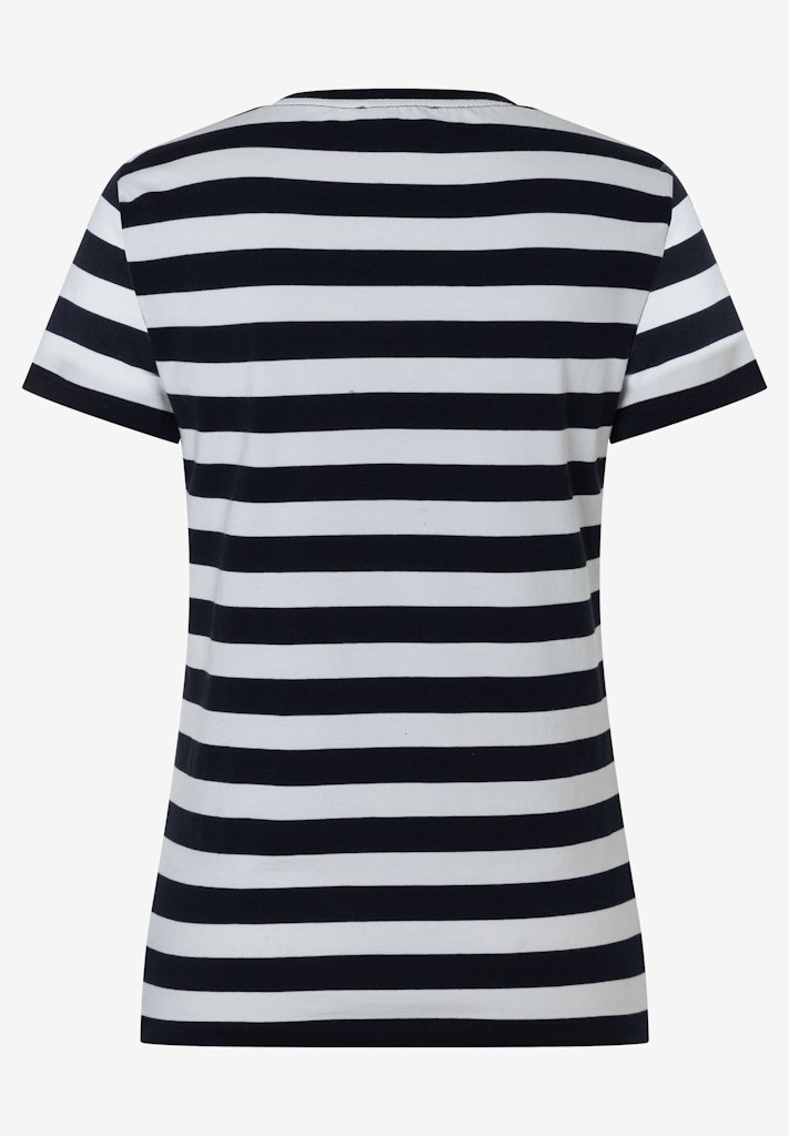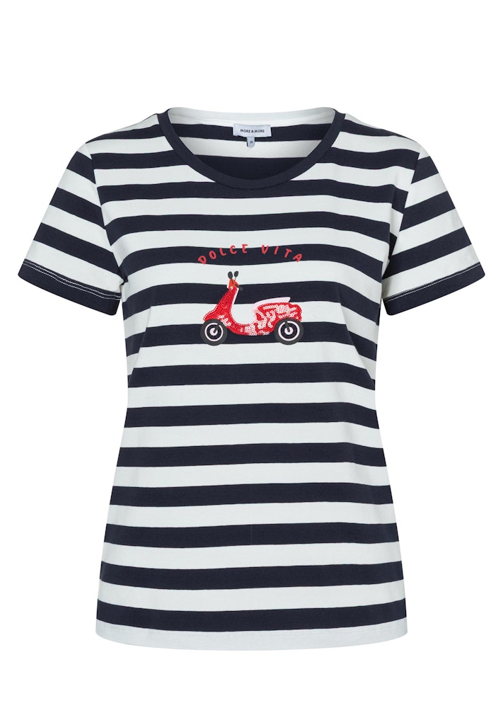 Mit diesem süßen T-Shirt von MORE & MORE ist Sommer, Sonne, Italien zum Greifen nah. Das 2-farbige Streifenmuster in marine/ecru verleiht dem Shirt eine maritime Optik, während der rote Paillettenroller auf der Front für einen besonderen Hingucker sorgt. Der klassische Schnitt mit Rundhalsausschnitt und das angenehm softe Material machen das Kurzarmshirt zum perfekter Begleiter für trendige Casual-Outfits mit modischen Twist.