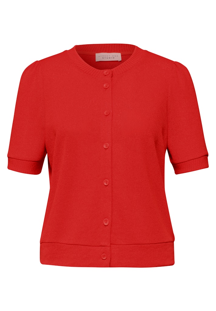 Die kurze Jacke von Street One Studio für Damen überzeugt mit seidigem Glanz und moderner Ausstrahlung. Der Rundhals und die Knopfleiste verleihen dem Design eine cleane Eleganz. Der fließende Viskosemix sorgt für ein leichtes, angenehmes Tragegefühl. Ideal, um schlichte Looks stilvoll zu veredeln. Strick-Optik Jacke Rundhalsausschnitt Kurzarm Unifarbe Angenehmer Viskosemix Zum Überziehen für sommerliche Styles Durchgehende Knopfleiste Material: 60% Viskose, 40% Polyester