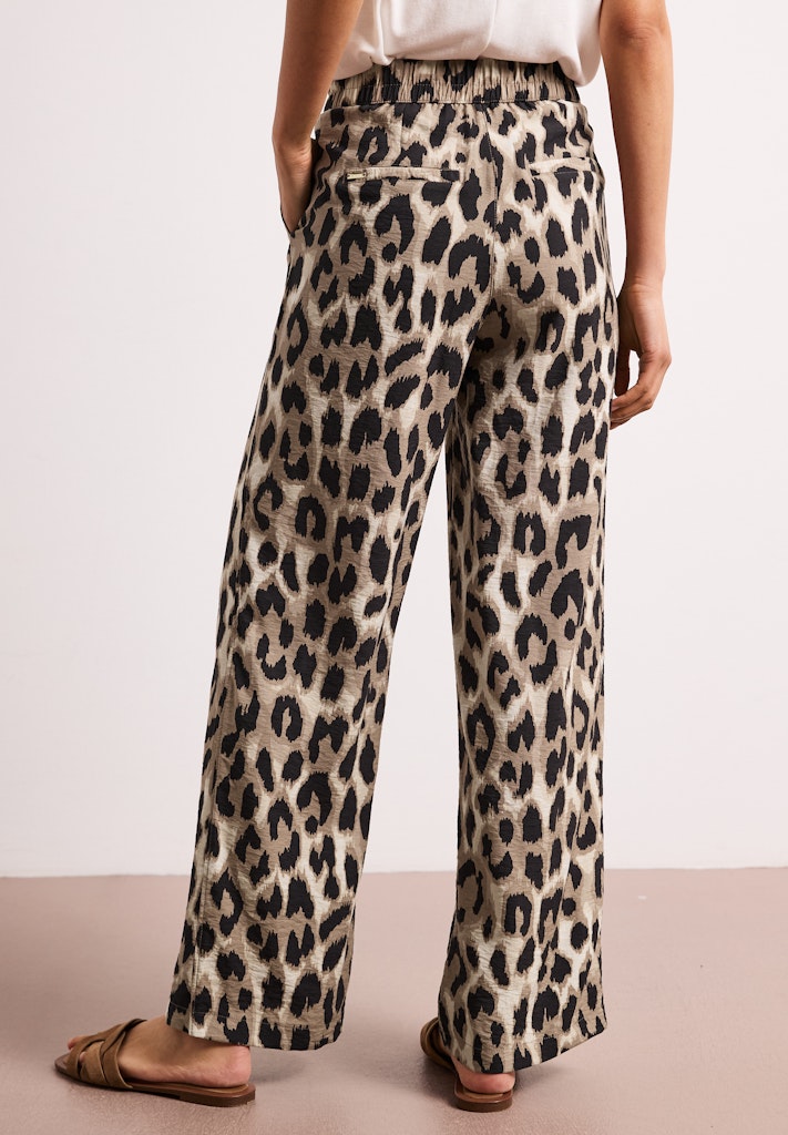 Die Wide Leg Hose mit Leo-Print von Street One für Damen bringt modisches Flair in deinen Look. Loose Fit und High Waist sorgen für eine trendige, lockere Silhouette. Der elastische Bund mit Tunnelzug bietet hohen Tragekomfort. Seitliche Taschen machen die Hose alltagstauglich. Twill Hose Loose Fit Wide Legs High Waist Modischer Look Material: 86% Viskose, 14% Nylon