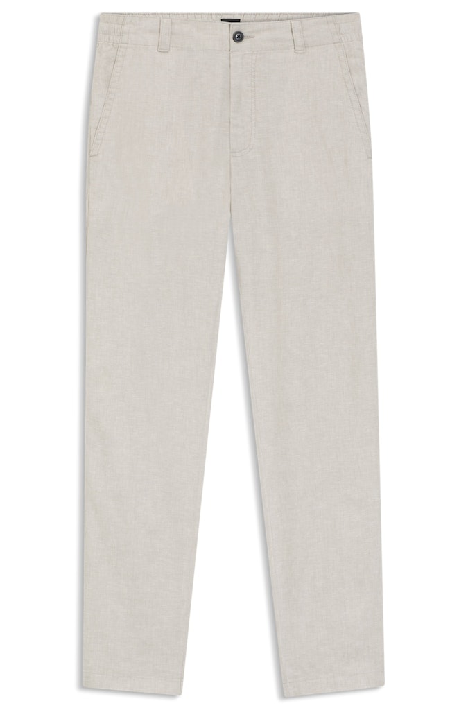 Mit einem elastischen hinteren Bund für eleganten Tragekomfort sind die BOSS Hose eine vielseitig kombinierbare Grundlage. Sommerlicher Leinen-Mix. Dezentes Logo-Detail.