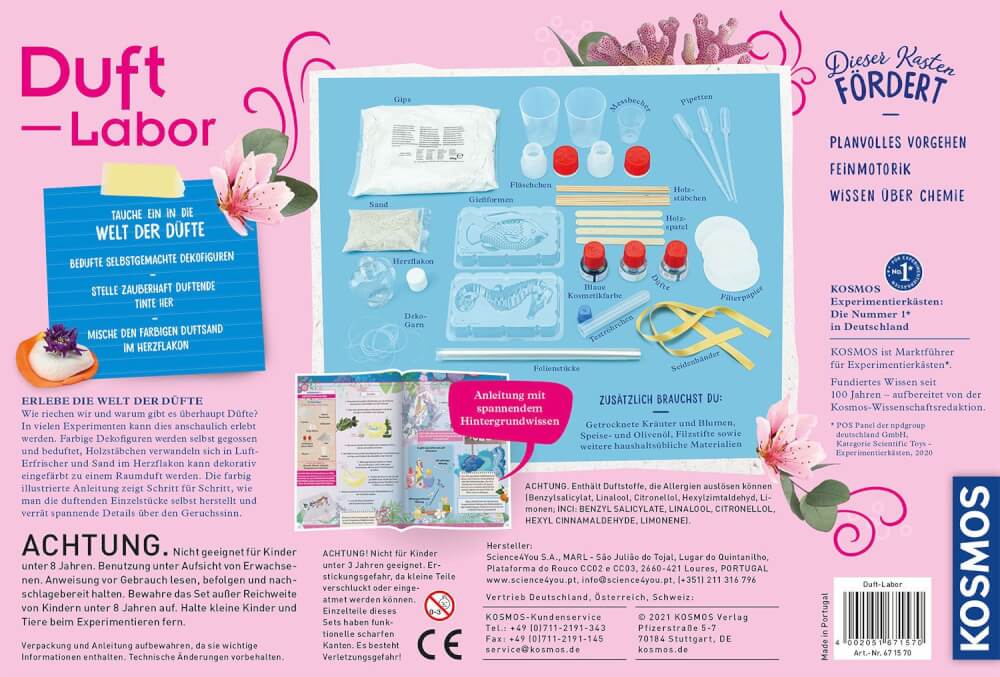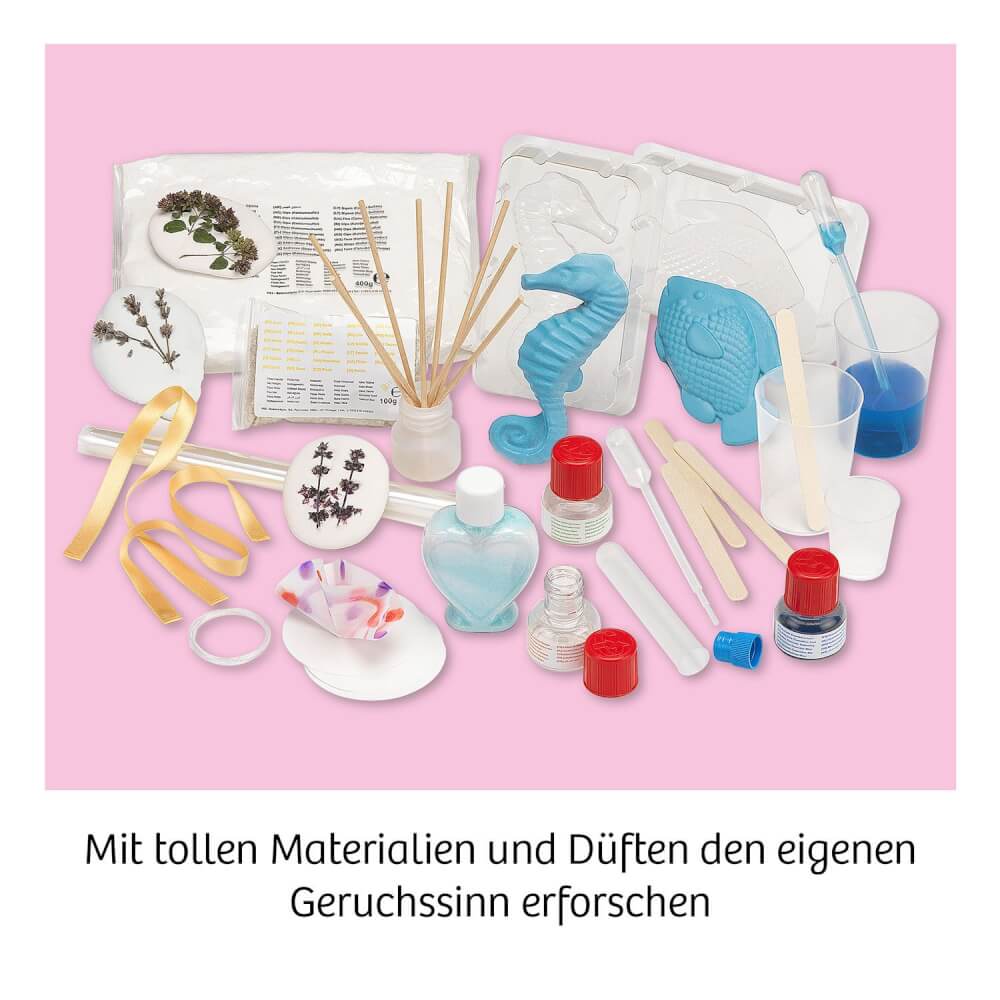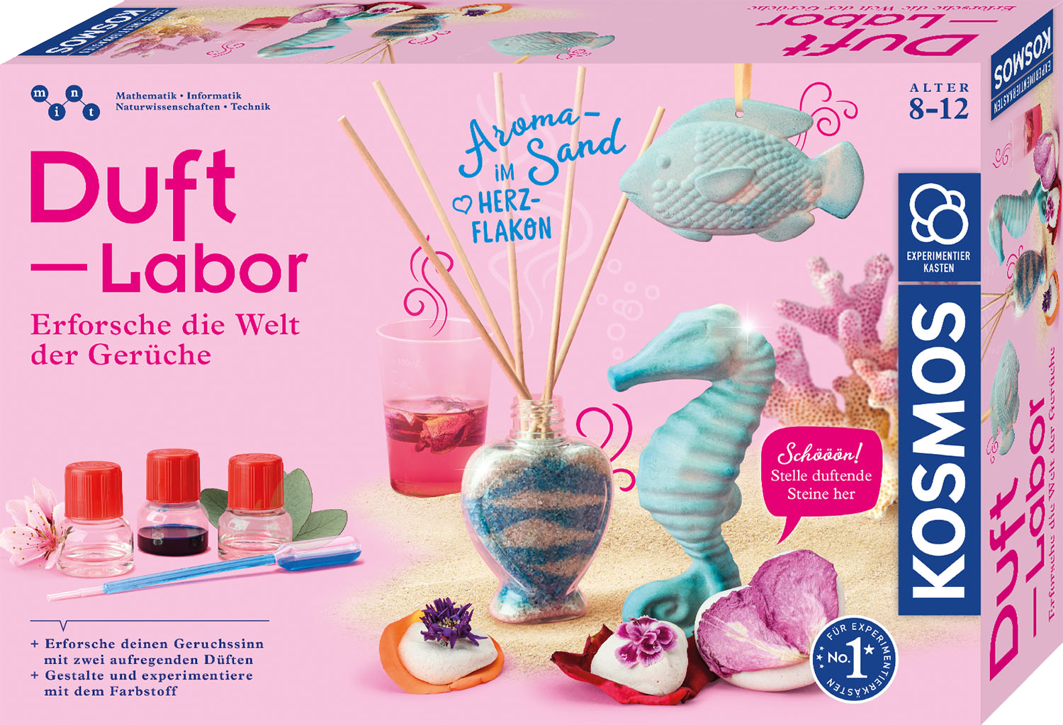 Ein zauberhafter Einstieg in die Welt der Gerüche. Mit diesem Labor werden zarte Düfte in verschiedensten Formen verarbeitet: Duftende Farbe und mit Blüten und Gewürzen verzierte Duftsteine. Bald riechen nicht nur Kinderzimmer und Bad wohltuend, sondern auch selbst gemachte Lesezeichen und farbige Blumen aus Filterpapier. Besonderes Extra: bunt geschichteter, duftender Sand in einer wunderschöner Herzflasche. Dazu verrät die Anleitung des KOSMOS Experimentiersets, wie der Geruchssinn des Menschen funktioniert, wie Pflanzen Duft-Aromen produzieren und weitere spannende Fakten rund um das Thema Parfum und Geruch. Eine spannende Reise in die Welt der Aromen für Kinder von 8 bis 12 Jahren.