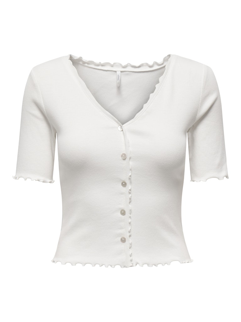 Verändere dein Alltagsoutfit in Sekundenschnelle, indem du mit einem femininen Oberteil einen weichen und schicken Akzent setzt. - Produkttyp : Top - Hals : V-Ausschnitt - Ärmel : Kurzarm - Verschluss : Knopfleiste - Details : Rüschendetail - Passform : Normal geschnitten