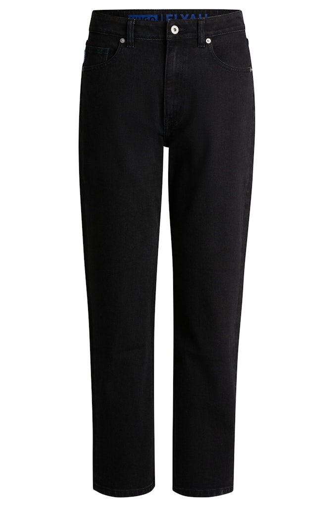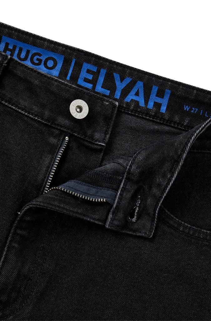 Lang geschnittene HUGO Jeans mit mittlerer Bundhöhe. Die zeitgemäße Hose mit geradem Beinverlauf ist aus Stretch-Denim mit tiefschwarzer Rinse-Waschung gefertigt.