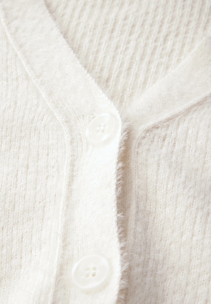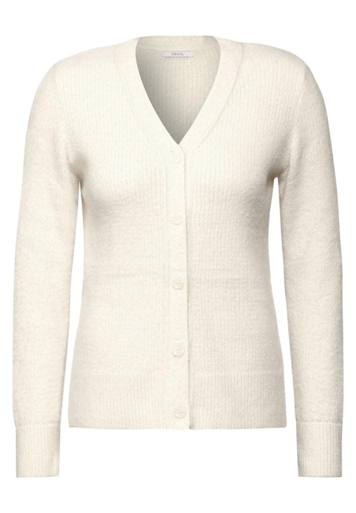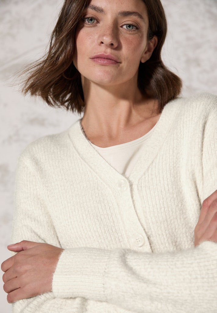 Dieser flauschige Federgarn Cardigan von CECIL für Damen bringt Gemütlichkeit in deinen Look. Der V-Ausschnitt und die Knopfleiste verleihen der Strickjacke eine feminine Note, während die langen Ärmel mit Bündchen für einen bequemen Sitz sorgen. Der angenehme Baumwollmix macht die Jacke besonders weich und komfortabel. Flauschige Strickjacke V-Ausschnitt Knopfleiste Langarm mit Bündchen Angenehmer Baumwollmix Material: 68% Baumwolle, 32% Polyester