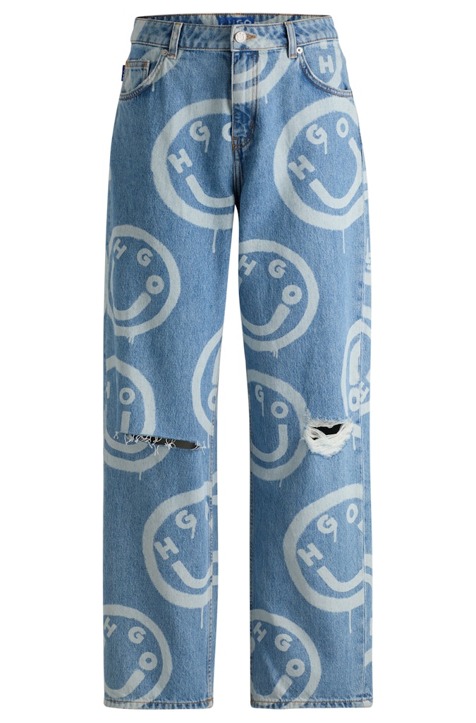 Die HUGO Womenswear Jeans im Used-Look der 90er-Jahre mit einem markanten, durchgehenden Graffiti-Print mit Happy HUGO Logo bringt frischen Wind in deinen Alltag. Baggy-Fit mit Used-Effekten an den Knien. Denim aus Baumwolle ohne Elasthan-Anteil für einen authentischen Look und ein angenehmes Tragegefühl. Trage dazu die passende Jacke für den perfekten Look.