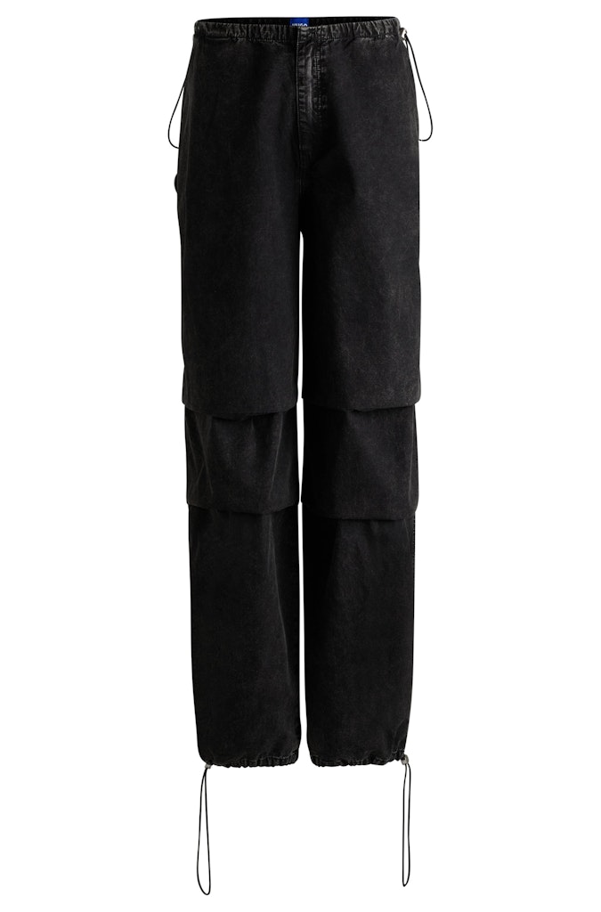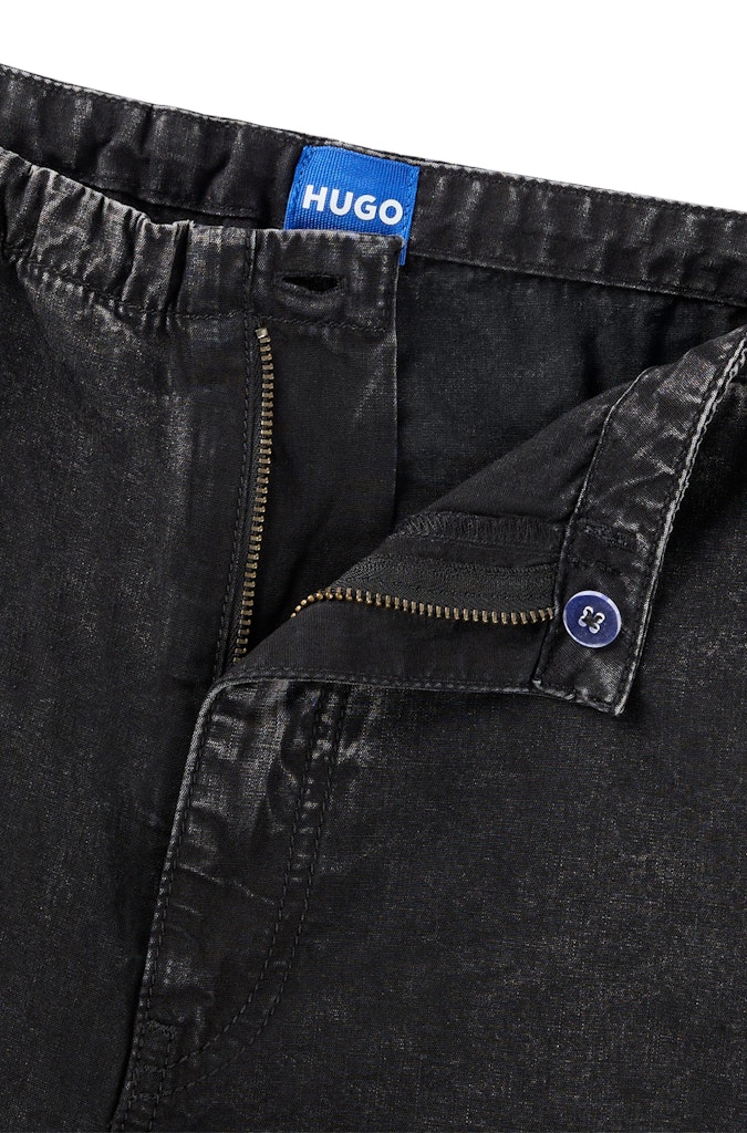 Leichte HUGO Jeans aus festem schwarzem Denim in Washed-Optik. Die Hose mit Baggy-Fit ist mit elastischen Kordeln versehen und mit einem Smiley-Logo bestickt. Dieses Produkt wird teilweise aus Bio-Baumwolle gefertigt. Unsere Bio-Standards erlauben keine Verwendung von synthetischen Düngemitteln, Pestiziden oder gentechnisch verändertem Saatgut.