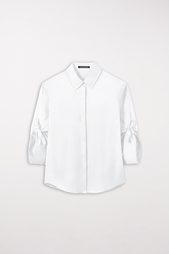 Kastig geschnittene Hemdbluse mit verdeckter Knopfleiste aus fein gewebtem Gabardine-Stretch. Die weiten Ärmel können individuell hochgebunden werden.
