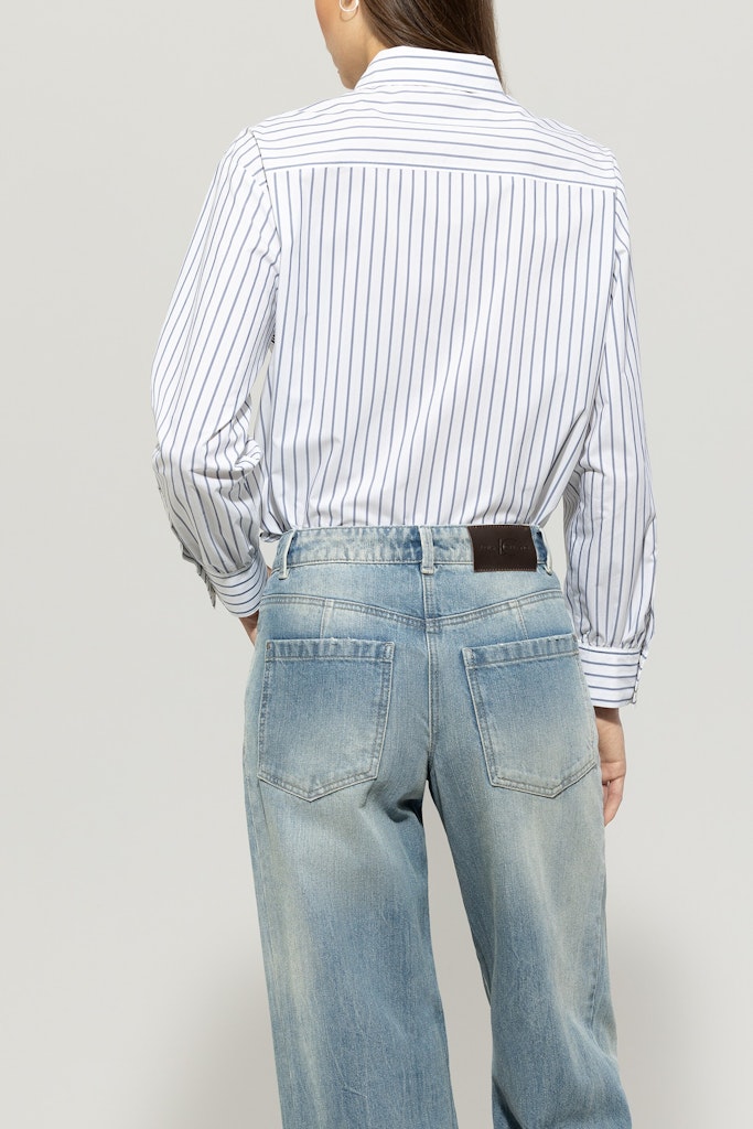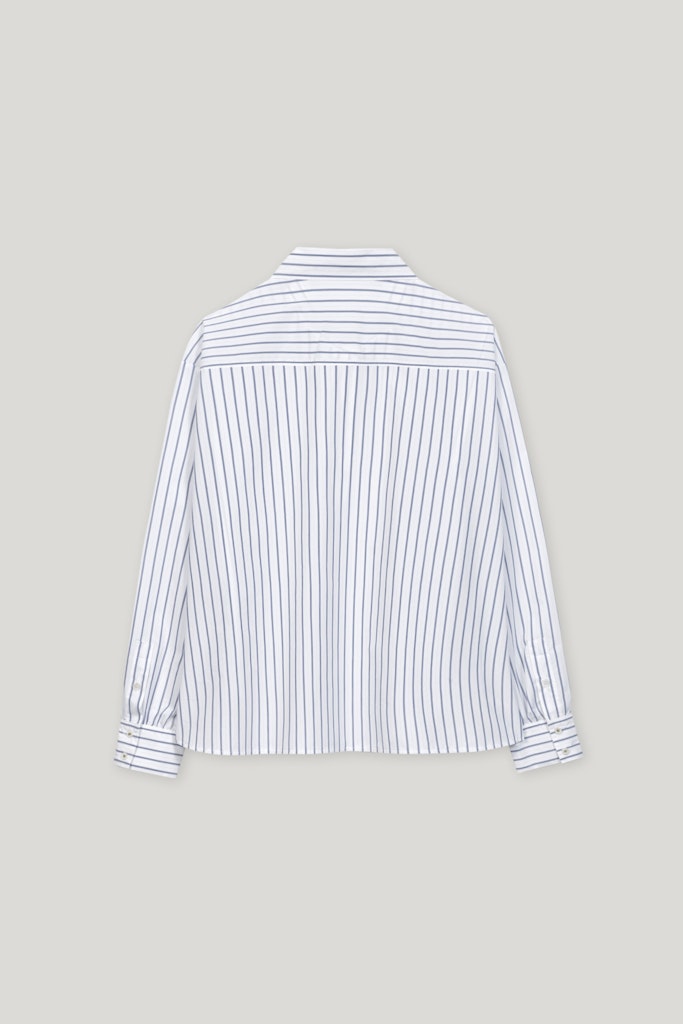 Hemdbluse mit Fantasie-Streifen-Dessin und gestreiftem Ripsband entlang der Seitennaht. Die Bluse ist im klassischen Design mit Kragen, Knopfleiste und einer aufgesetzten Brusttasche gestaltet.