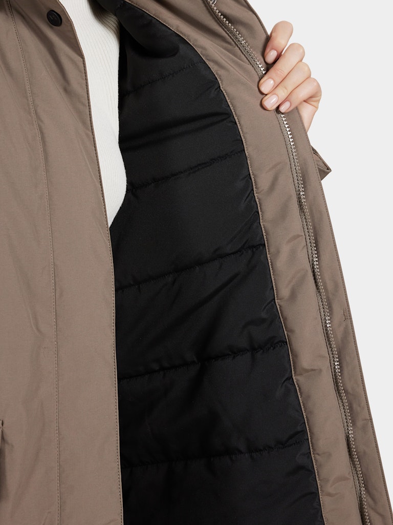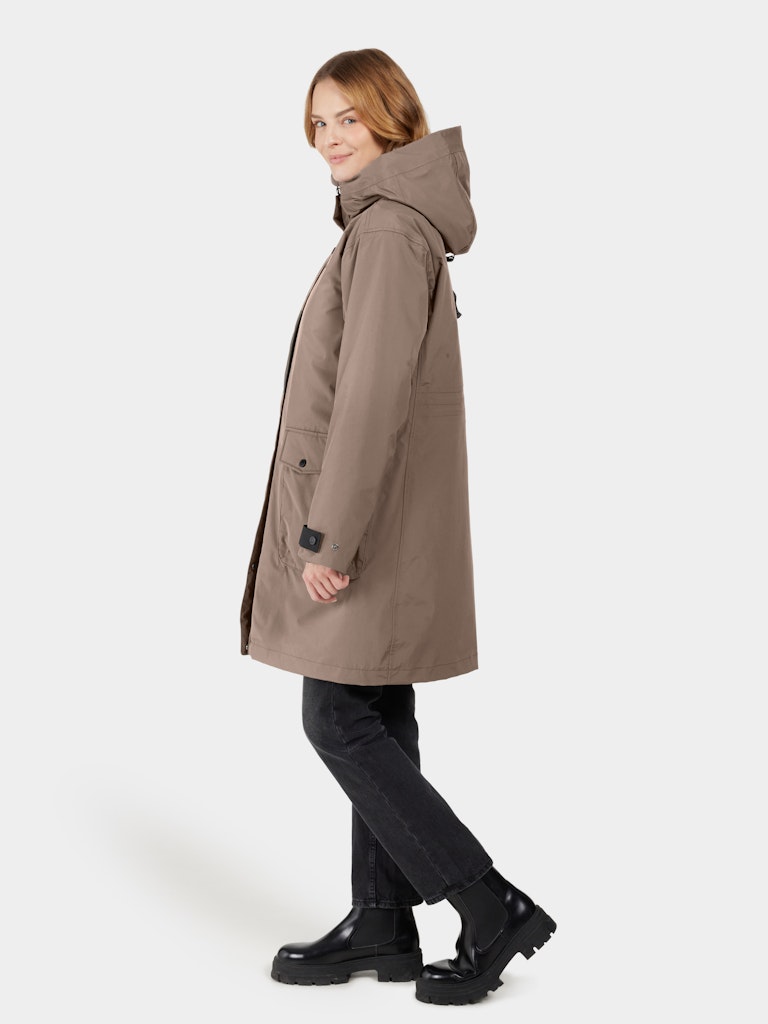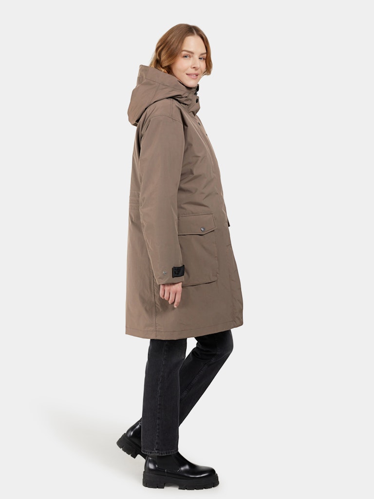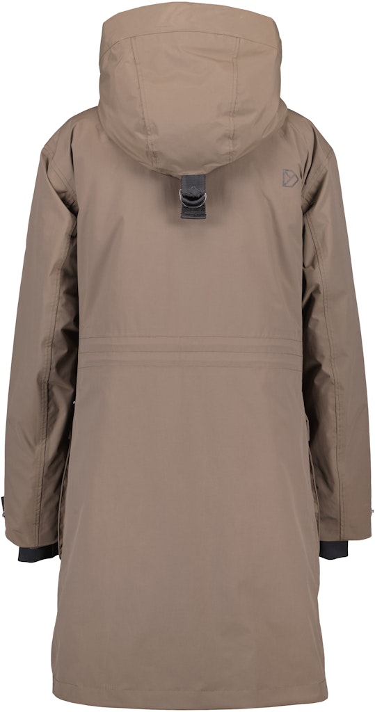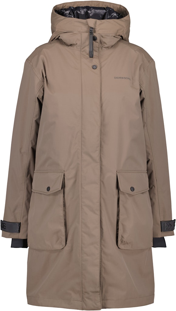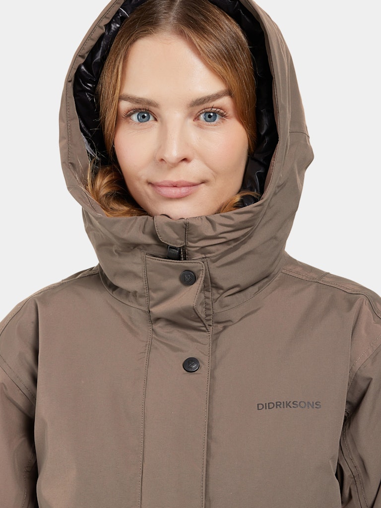 A casual didriksons parka with trendy details. Designed for a woman who needs to be kept warm with style. 50% recycled polyamide, soft with dull surface. Inside at back part, double-woven fleece mesh, Female shaped. Adjustable hood. sleeve strap. Drawstring at back piece. Total number of pockets: 3. Many functional cozy details, hood and collar in cozy warming padding, warming back with double-woven fleece mesh.