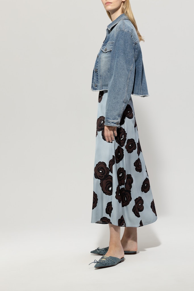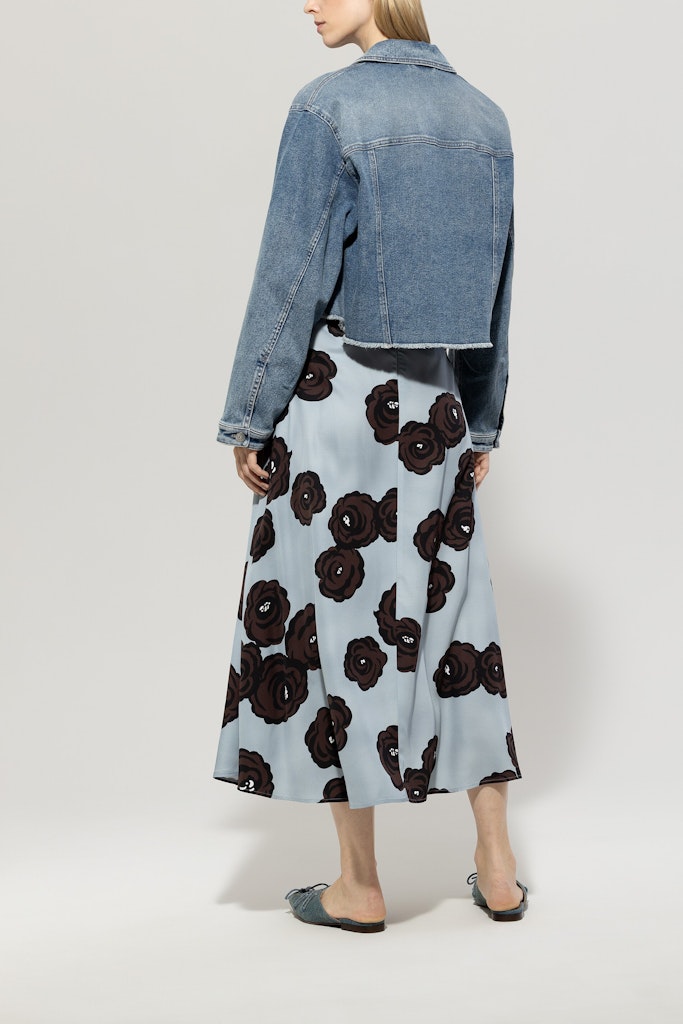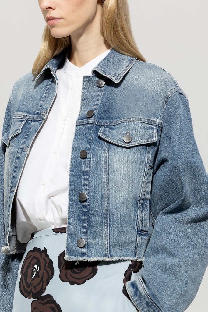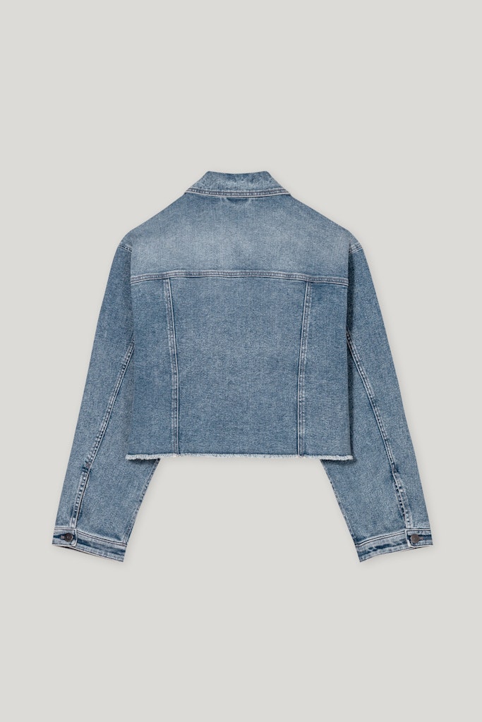 Kurze Jeansjacke aus Authentic-Denim mit Vintage-Waschung, ausgefranster Saumkante und vier Taschen. Kontrastfarbene Nahtdetails und Metallknöpfe an der Knopfleiste, den Patten und den Manschetten ergänzen das typische Design. In der Variante zeigt die Jacke eine dekorative Applikation.