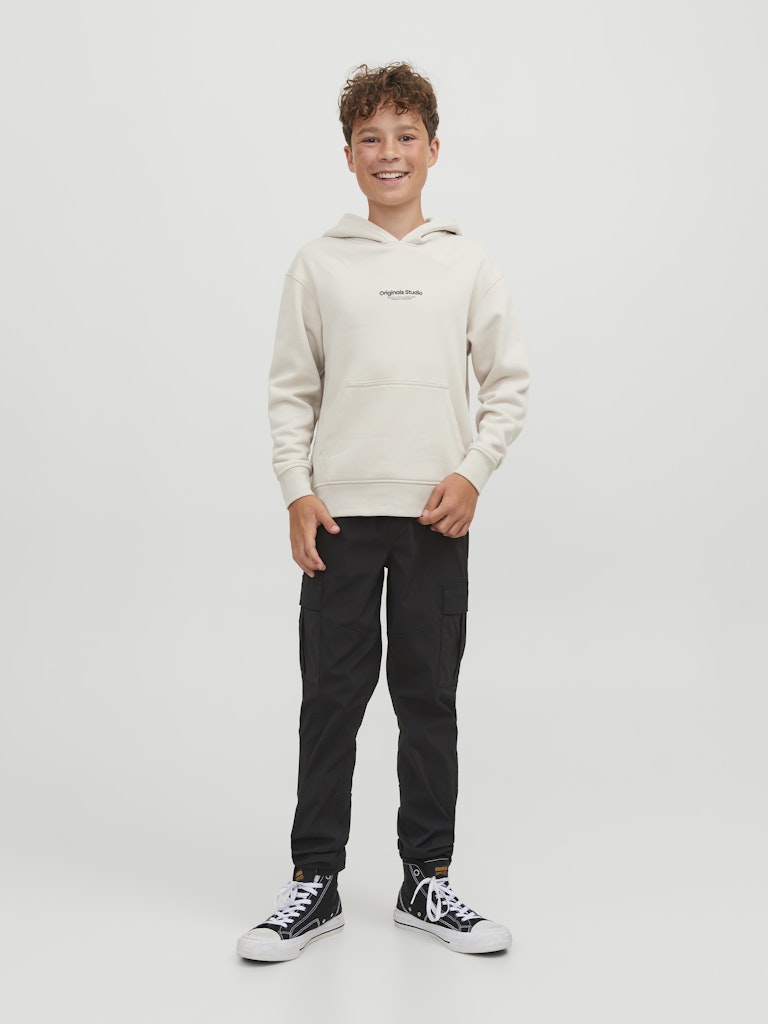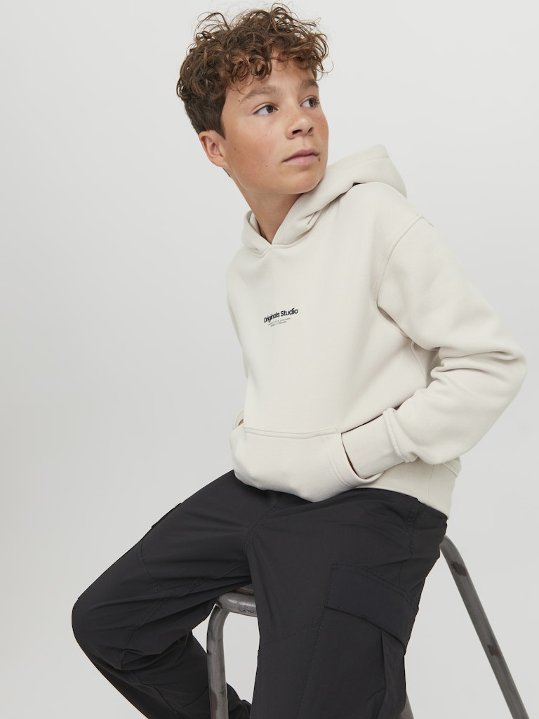 Keine Garderobe ist komplett ohne einige bewährte Basics wie Sweatpants.Angerauter Stoff mit einer weichen Innenseite. Leicht angeraute Stoffe haben eine etwas flauschigere Innenseite, die sich weich anfühlt.Entdecke die aufregende Welt von Jack and Jones Junior, in der Mode durch jugendliche Energie und lebhaften Charme zum Leben erweckt wird. Unsere Kollektionen bieten eine Mischung aus neuen, trendigen Designs, die Jungen im Alter von 3-16 Jahren ansprechen. Tauche in hochwertige und bequeme Styles ein, die speziell für junge Fashion-Liebhaber entwickelt wurden. Bei Jack and Jones Junior interpretieren wir Mode für Jungs im Alter von 3 bis 16 neu, indem wir coole Passformen und moderne Styles kombinieren und dabei immer wieder Elemente aus der Erwachsenenmode einfließen lassen.. - Produkttyp : Kapuzenpullover - Hals : Kapuze - Ärmel : Langarm - Ärmel : Eingesetzte Ärmel - Taschen : Känguru Tasche - Futter : Futter Kapuze aus gleichem Material - Print : 3D-Druck für eine dreidimensionale Optik - Körperform : Junior - Passform : Locker geschnitten