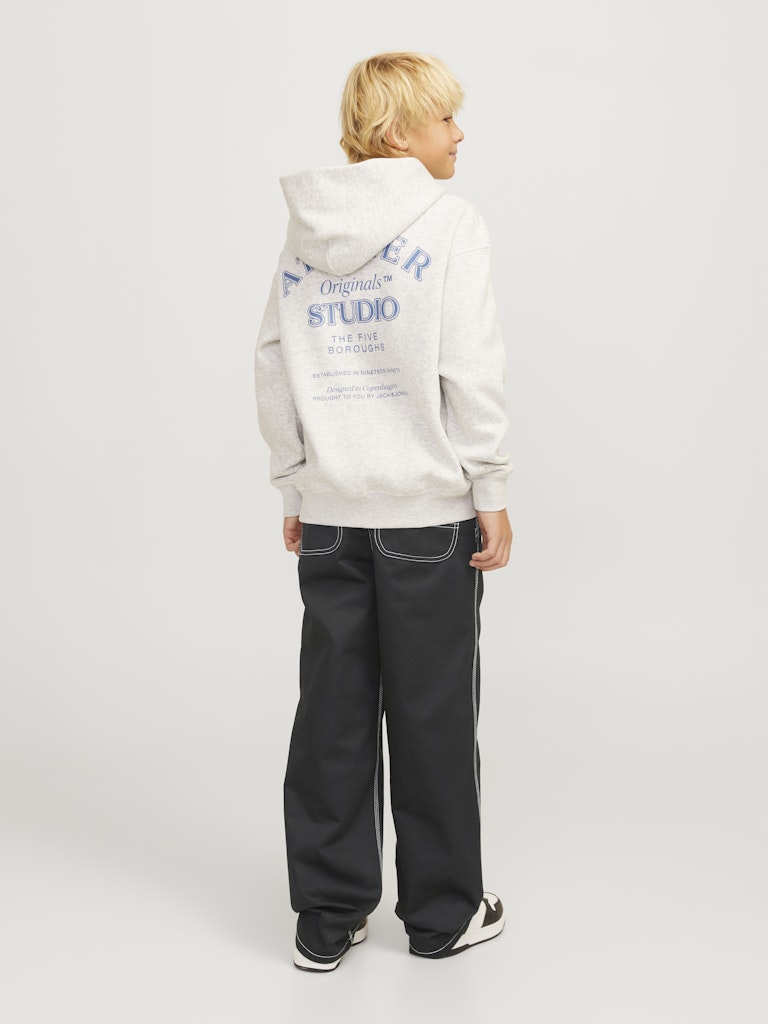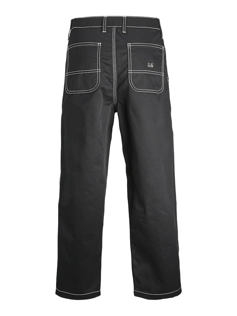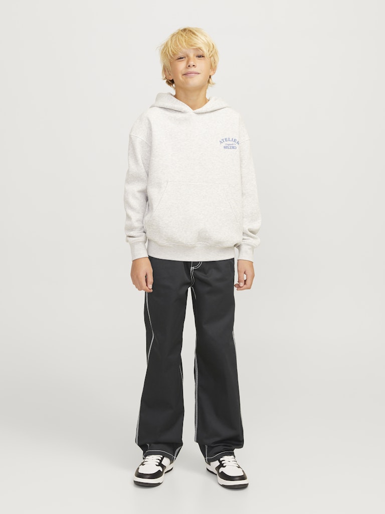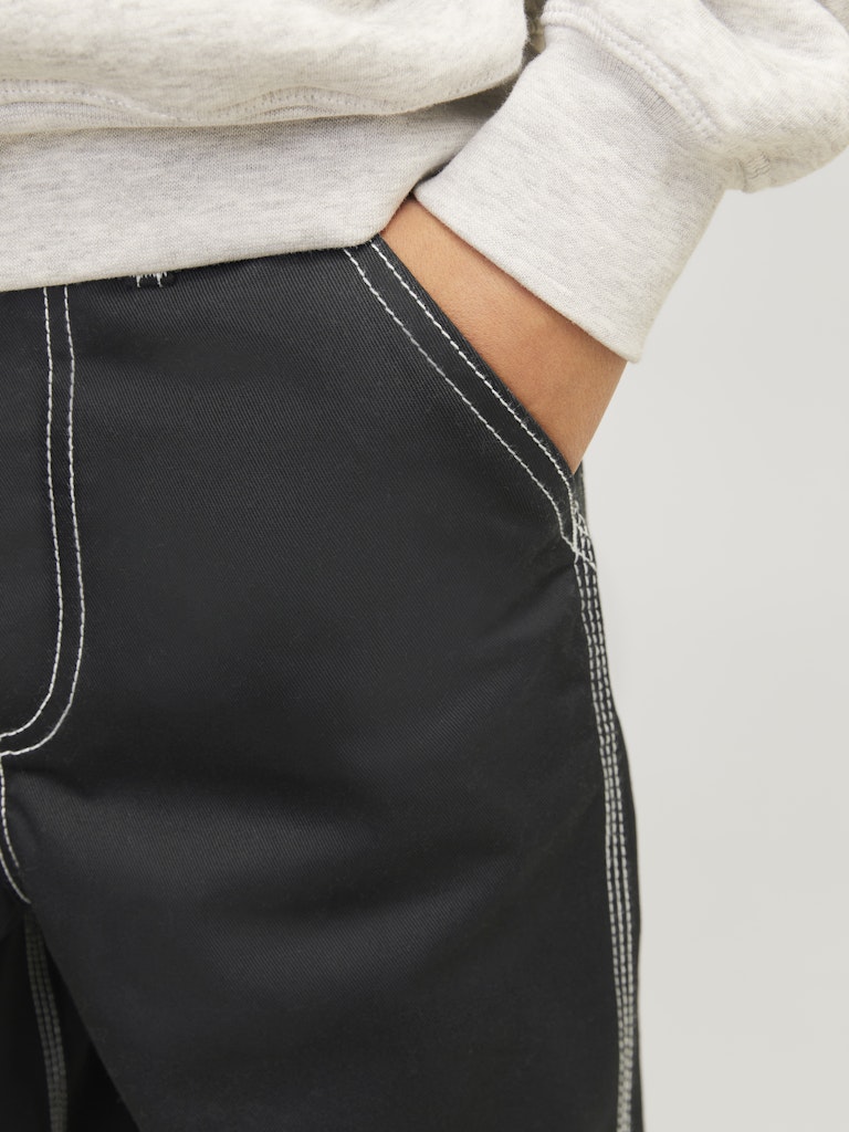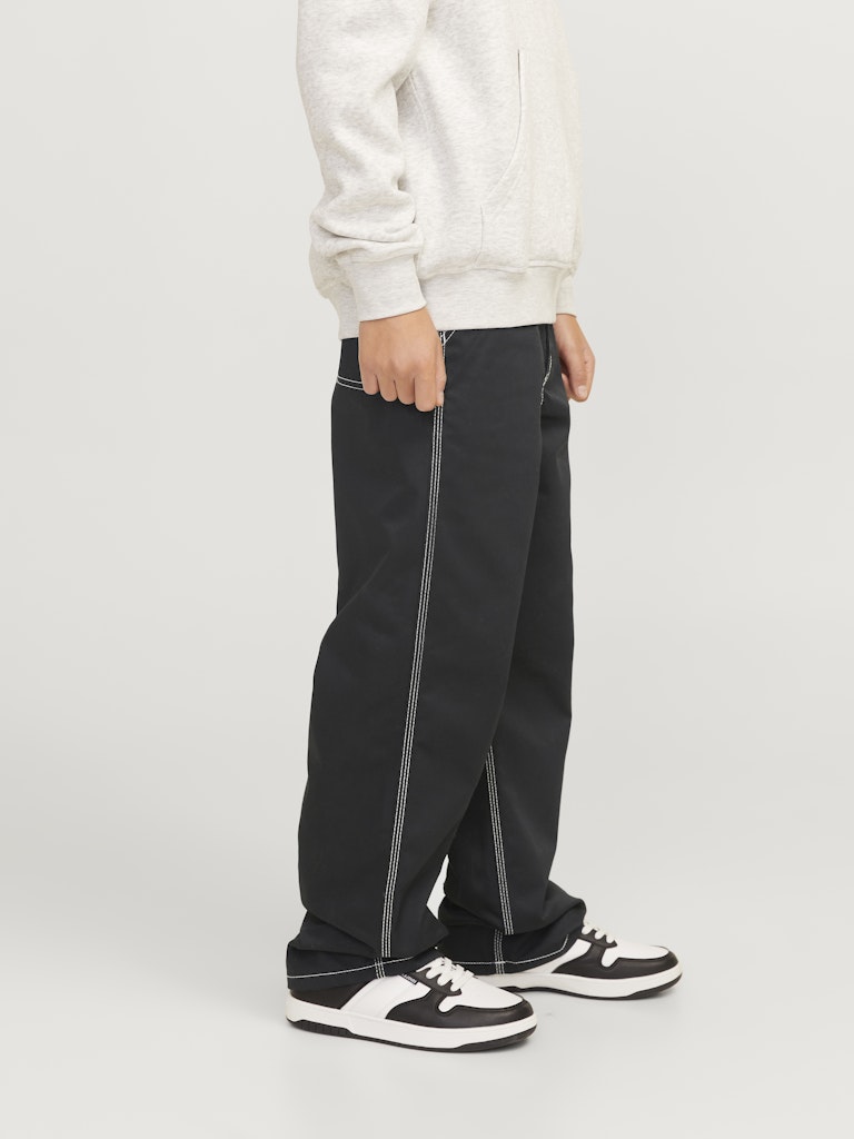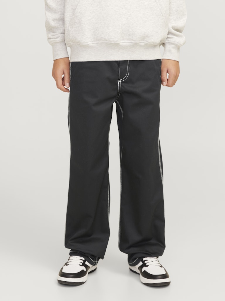 Wähle eine bequeme Hose mit funktionalen Details und kreiere einen abgestimmten und modernen Look, der coole Work-Vibes ausstrahlt, indem du sie mit einem Sweatshirt und Turnschuhen oder einer Jacke und Stiefeln kombinierst.Webstoff ist fest und robust und dehnt sich nicht wie gestrickte Stoffe.Entdecke die aufregende Welt von Jack and Jones Junior, in der Mode durch jugendliche Energie und lebhaften Charme zum Leben erweckt wird. Unsere Kollektionen bieten eine Mischung aus neuen, trendigen Designs, die Jungen im Alter von 3-16 Jahren ansprechen. Tauche in hochwertige und bequeme Styles ein, die speziell für junge Fashion-Liebhaber entwickelt wurden. Bei Jack and Jones Junior interpretieren wir Mode für Jungs im Alter von 3 bis 16 neu, indem wir coole Passformen und moderne Styles kombinieren und dabei immer wieder Elemente aus der Erwachsenenmode einfließen lassen.. - Produkttyp : Klassische Hosen - Verschluss : Reißverschluss - Taschen : Gesäßtaschen, Taschen vorn - Taille : Mid Rise - Beindetails : Säume zum Umschlagen - Details : Hammer-Schlaufe - Passform : Trag unseren Wide Fit für eine Passform, die rundum viel Platz bietet. Mit weiten Oberschenkeln, Knien und Beinöffnungen