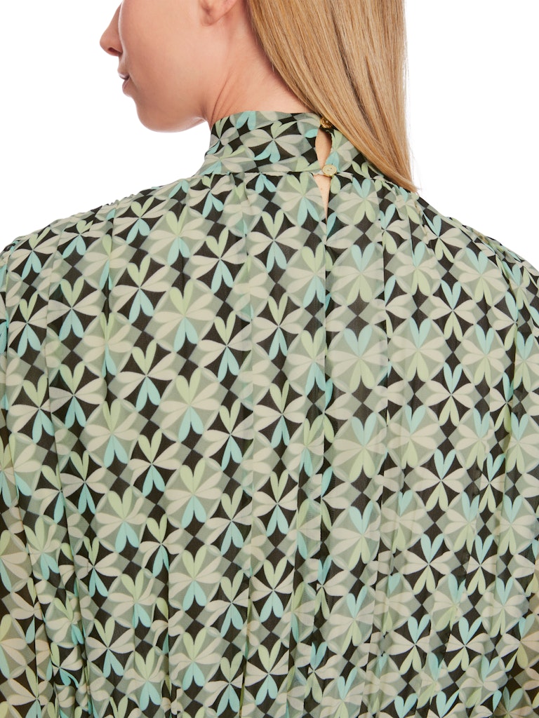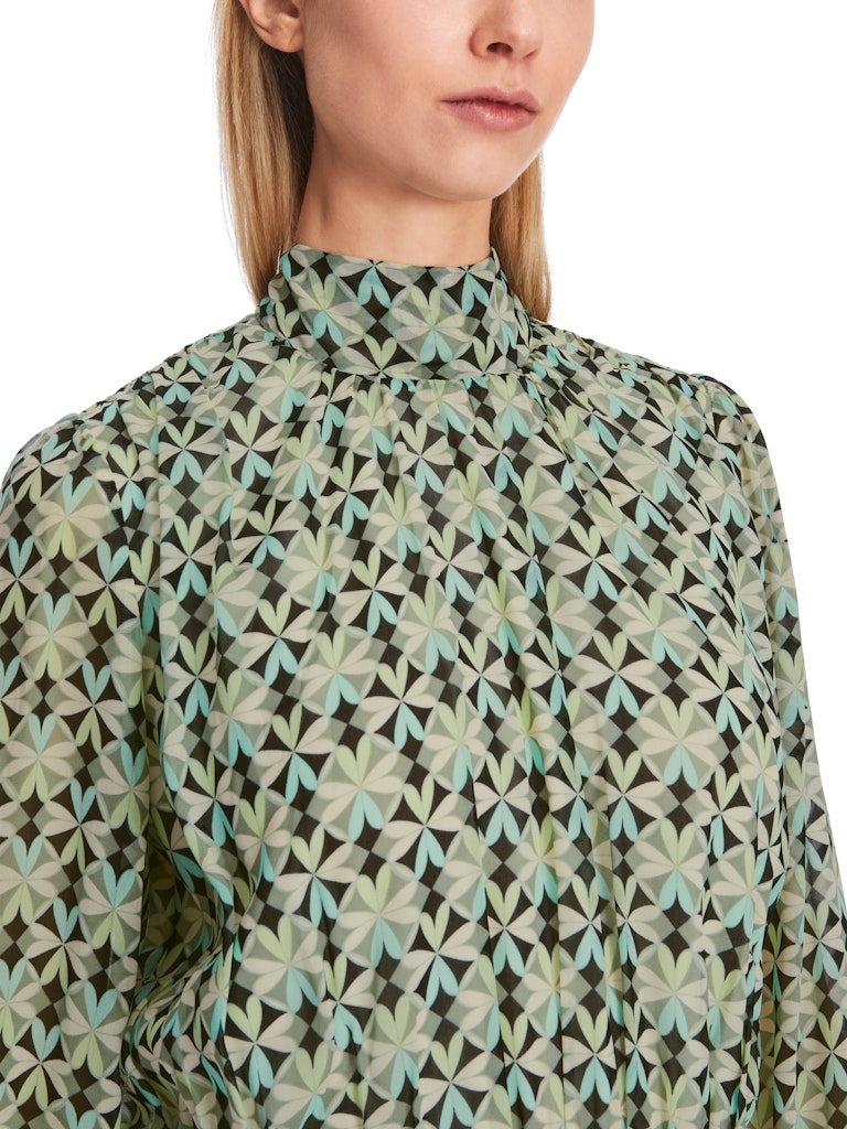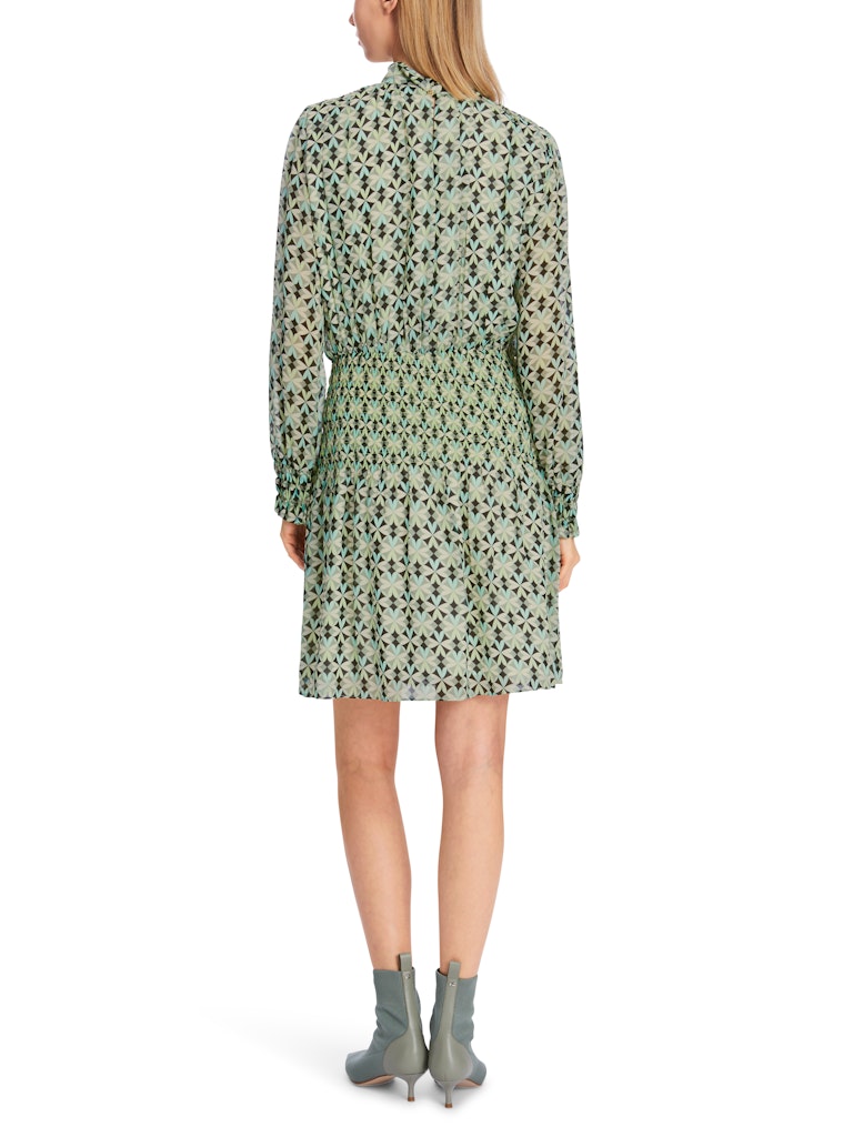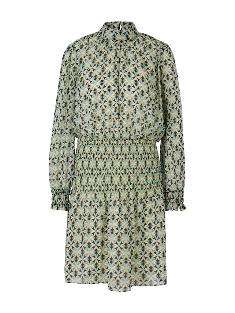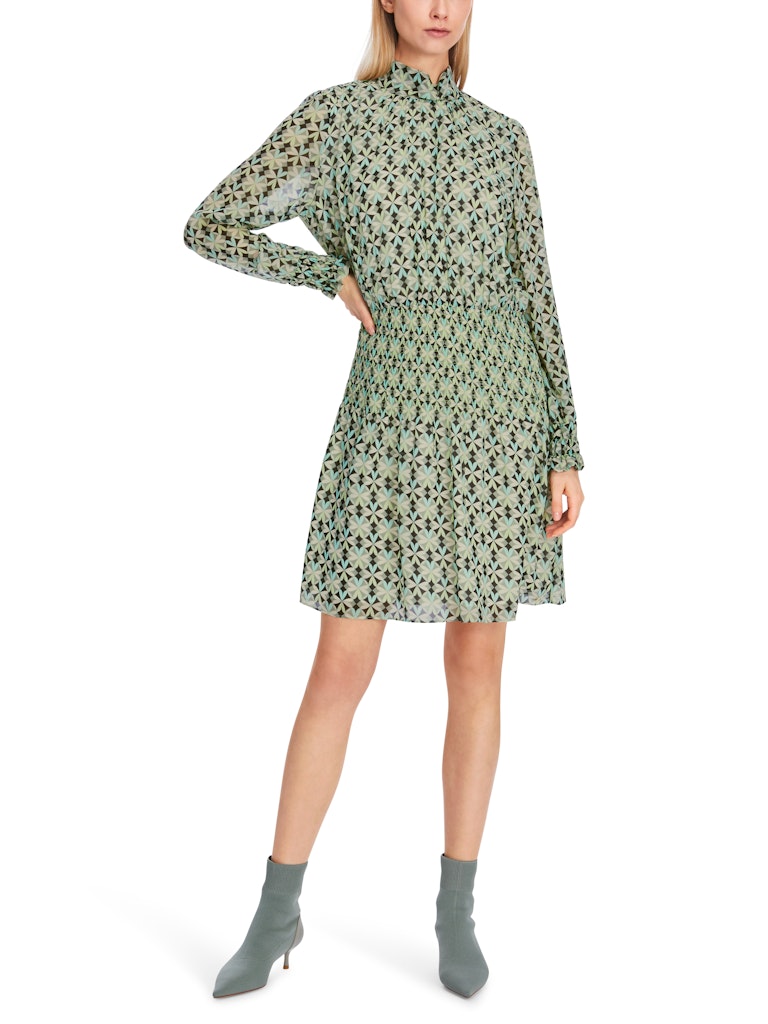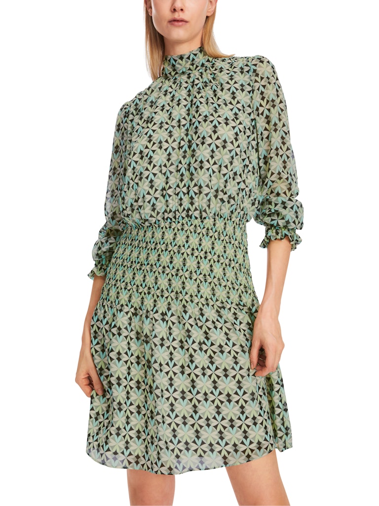 Kleid mit Smokeinsätzen|Smokeinsätze an der Taille, dem Ärmelsaum sowie die Schulternähten verleihen diesem weiten Kleid eine figurbetonende Silhouette. Es ist Allover mit einem floral inspirierten Muster versehen. Der Stehkragen wird mit einem Knopf geschlossen. Das Kleid in Minilänge besticht mit fließendem Material.|Figurbetonende Silhouette|Stehkragen mit Knopf|Minilänge|Fließendes Material|Das Model ist 179 cm groß und trägt N3/38.