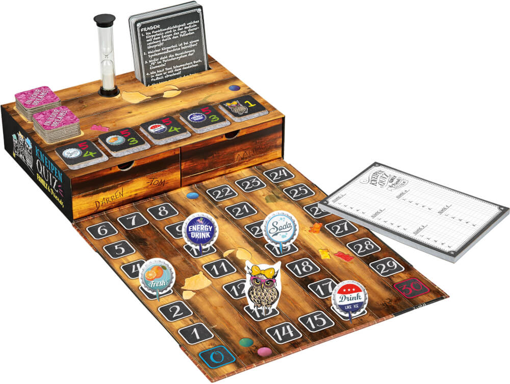 Für Familie und Freunde: Die Spieler quizzen gegen das Spiel und beantworten Fragen zu verschiedenen Themen (Allgemeinwissen, Kunst, Geschichte, Sport usw.) Das Besondere ist, dass es auf jeder Karte eine Family-and-Friends-Frage gibt. Darin dreht sich alles rund ums gemeinsame Leben. Wer kennt die Lieblingspizza des besten Freunds und wer weiß, wohin Mama mit einer Zeitmaschine reisen würde? * Die Spieler spielen als Team gegen das Spiel. * Es gibt 5 Runden und sie müssen pro Runde 5 Fragen innerhalb von 5 Minuten beantworten. * Davon sind 4 Fragen normale Quizfragen und 1 Frage ist die Family-and-Friends-Frage. * Jeweils ein Spieler beantwortet eine Family-and-Friends-Frage geheim und notiert die Antwort. Die anderen Spieler raten, welche Antwort er wohl gegeben hat. * Die Quizfragen beantworten die Spieler immer gemeinsam als Team. * Je mehr Fragen die Spieler richtig haben, desto weniger Punkte bekommen die Gegner. * Die Spieler gewinnen nur, wenn sie ihre Gegner hinter sich lassen.