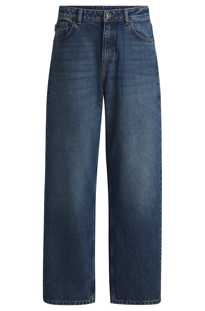 HUGO Jeans mit niedriger Bundhöhe. Die blaue Hose mit lockerer Passform und weitem Beinverlauf ist mit einer charakteristischen Stickerei versehen. Die Rohstoffe dieses Produkts stammen aus regenerativer Landwirtschaft: Der Ansatz fördert und stellt die Bodengesundheit wieder her und zielt darauf ab, das Klima, Wasserressourcen und die Biodiversität zu schützen und die Regeneration des Mutterbodens zu verbessern. Regenerative Landwirtschaft setzt sich auch für das Tierwohl und faire Arbeitsbedingungen der Bauern ein.