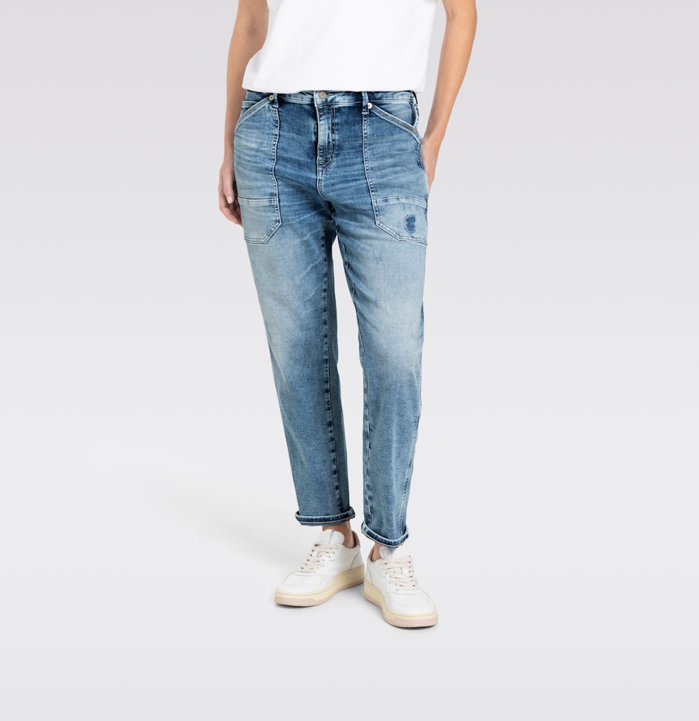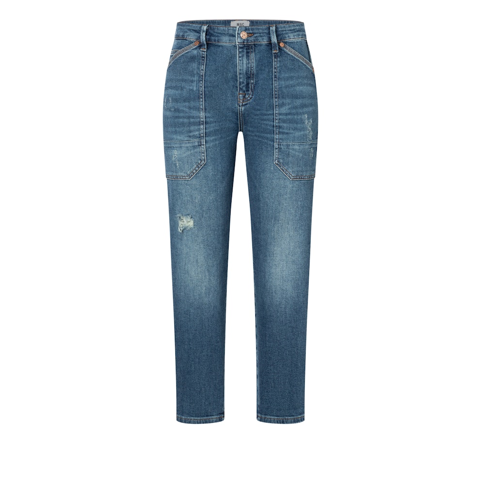 Relaxed Fit, Straight Leg, gerades, lässig sitzendes Bein, mittlere Leibhöhe, Five Pocket, große, aufgesetzte Taschen vorne und hinten, sportive Naht-Details, moderne Destroyed-Effekte, dezent umgeschlagener Saum, Authentic Comfort Vintage Denim, hochwertiger, elastischer Denim mit hohem Baumwoll-Anteil, authentische Optik, angenehmer Griff, hoher Tragekomfort, über Better Cotton gesourcte Baumwolle, Das Model ist 1,75m groß und trägt die MAC Hosengröße 36, Fußweite bei Größe 36: 38cm