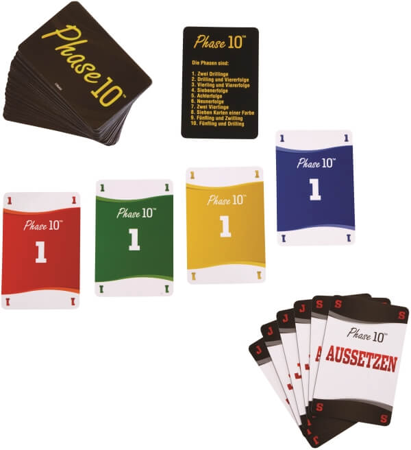 Ein spannendes, Rommé-ähnliches Kartenspiel mit einem ganz besonderen Dreh konzipiert von den Machern von UNO! Ziel des Spiels ist es, als Erster 10 verschiedene Phasen abzuschließen zwei Drillinge, eine Siebenerfolge, sieben Karten einer Farbe und weitere. Die Herausforderung: In jeder Spielrunde muss eine bestimmte Phase abgeschlossen werden. Wer die Phase abschließt, darf mit der nächsten weitermachen. Alle anderen müssen es erneut versuchen. Eine spannende Herausforderung für anspruchsvolle Spieleabende. Für 2 bis 6 Spieler. Ein spannendes, Rommé-ähnliches Kartenspiel mit einem ganz besonderen Dreh konzipiert von den Machern von UNO! Ziel des Spiels ist es, als Erster 10 verschiedene Phasen abzuschließen zwei Drillinge, eine Siebenerfolge, sieben Karten einer Farbe und weitere. Die Herausforderung: In jeder Spielrunde muss eine bestimmte Phase abgeschlossen werden. Wer die Phase abschließt, darf mit der nächsten weitermachen. Alle anderen müssen es erneut versuchen. Eine spannende Herausforderung für anspruchsvolle Spieleabende. Für 2 bis 6 Spieler.