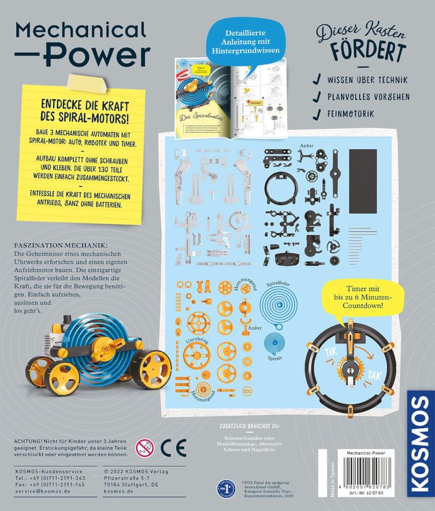 Was geschieht, wenn Muskelkraft auf eine Spiralfeder trifft? Es wird mechanisch! Egal ob Timer-Uhr, Rennauto oder Roboter - hier testen Kinder zwischen 8 und 12 Jahren unterschiedliche Modelle und entdecken eine der ältesten Wissenschaften der Welt. Ein Antrieb, völlig emissionsfrei funktioniert! Damit lernen die Kinder spielerisch, dass es ganz unterschiedliche Arten gibt, für Fortbewegung zu sorgen. Die Anleitung führt sie Schritt für Schritt durch alle Aufbauten und Experimente und gewährt einen Einblick in die Grundlagen der Physik und Mechanik. Mit dem KOSMOS Experimentierkasten wird aus Modellbau ein toller Forscherspaß. Clever!