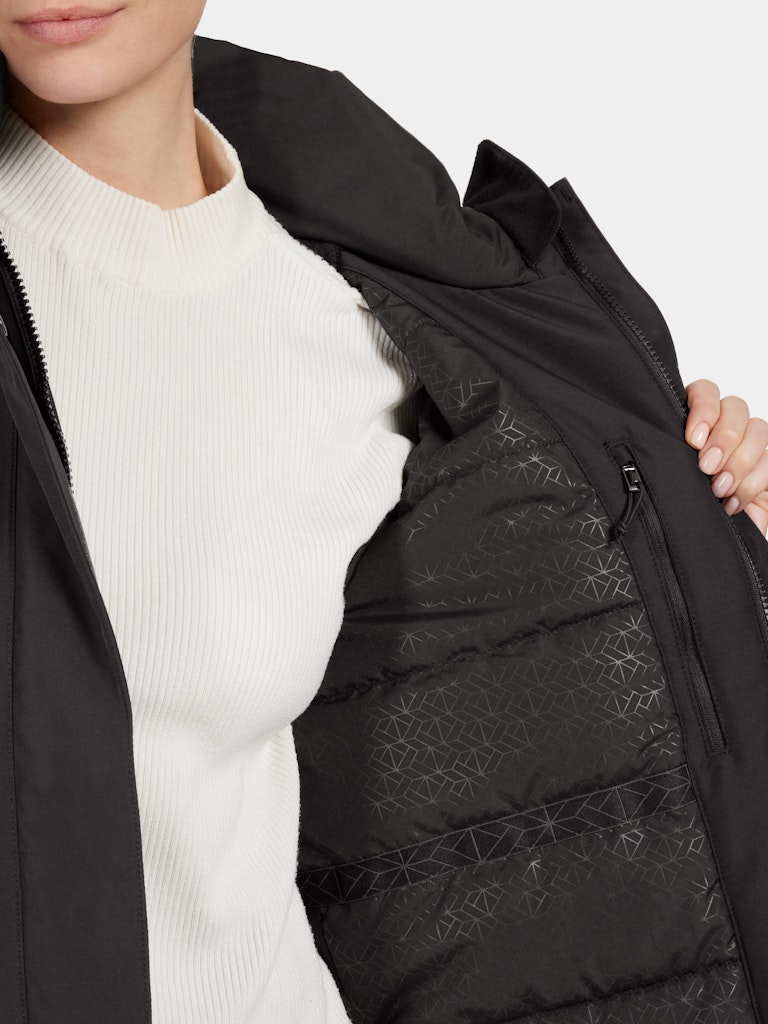 Collar: Padded collar, Collar: With pile inside, Front: Two-way frontzip, Other: Chin guard, Pocket: Front pocket with zipper, Pocket: Inner pocket with zipper, Reflective: Logo print, Sleeve end: Inside elastic cuff