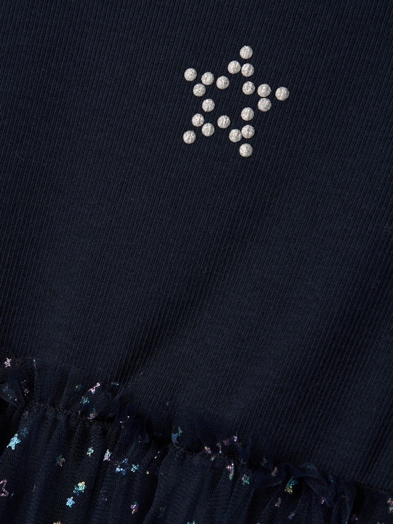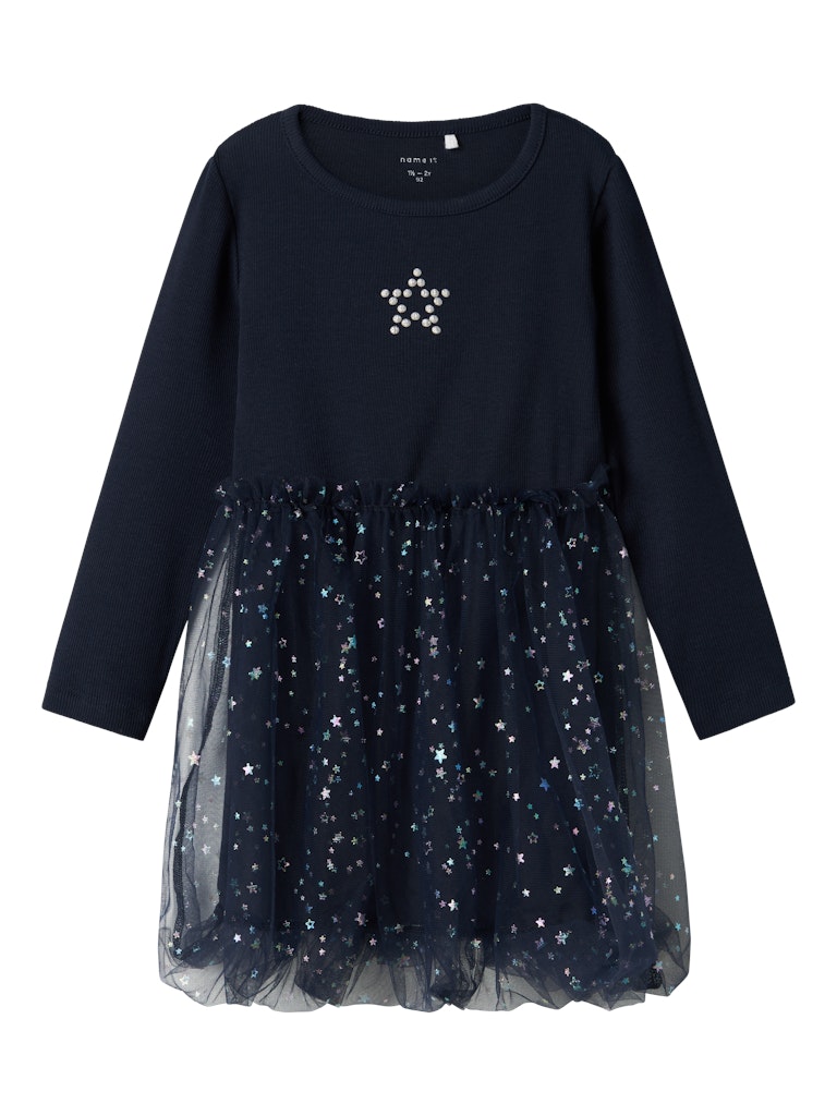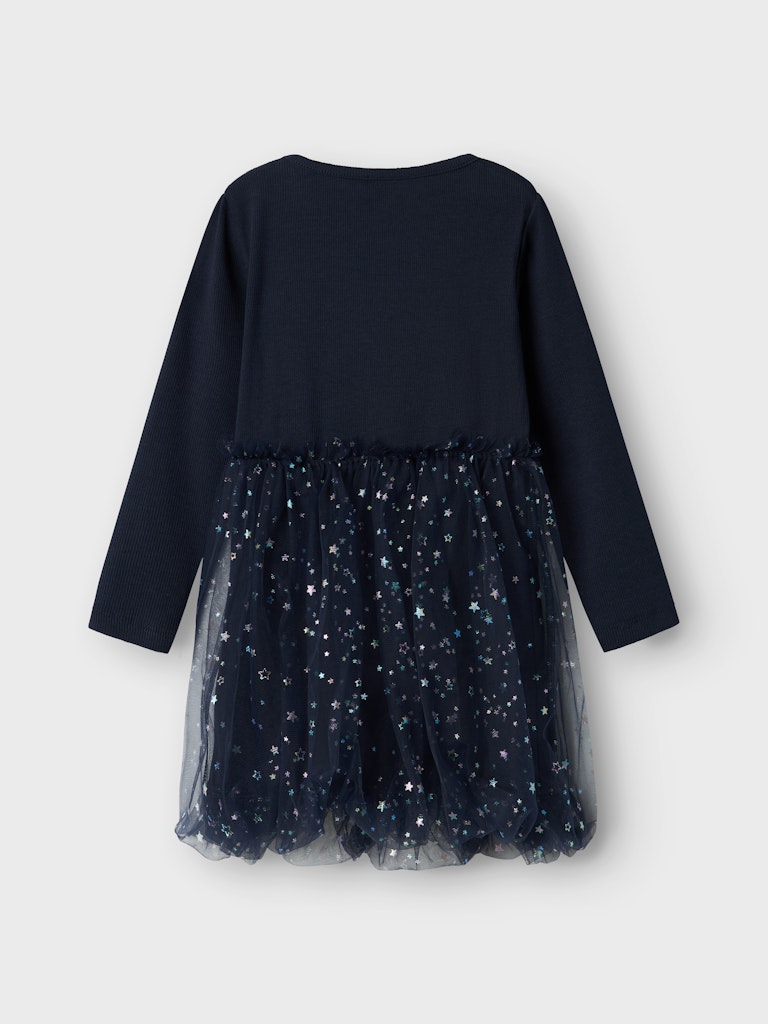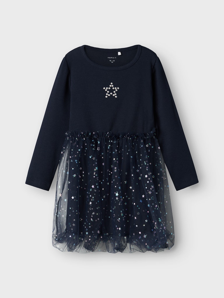 Mit diesen lustigen und glamourösen Partystyles ist dein Kind das ganze Jahr über für Feste, Partys und besondere Anlässe gerüstet. Rippstrick trägt sich angenehm und hat ein längs gestreiftes Muster, eine gute Elastizität und einen zeitlosen Look.- Produktart: Kleid- Print : Glitzerprint für einen glänzenden & coolen Look- Ausschnitt : Rundhalsausschnitt- Ärmel : Lange Ärmel- Innenfutter : Innenfutter aus Bio-Baumwolle für Komfort- Weitere Details: Tüll-Detail- Passform : Regular Fit