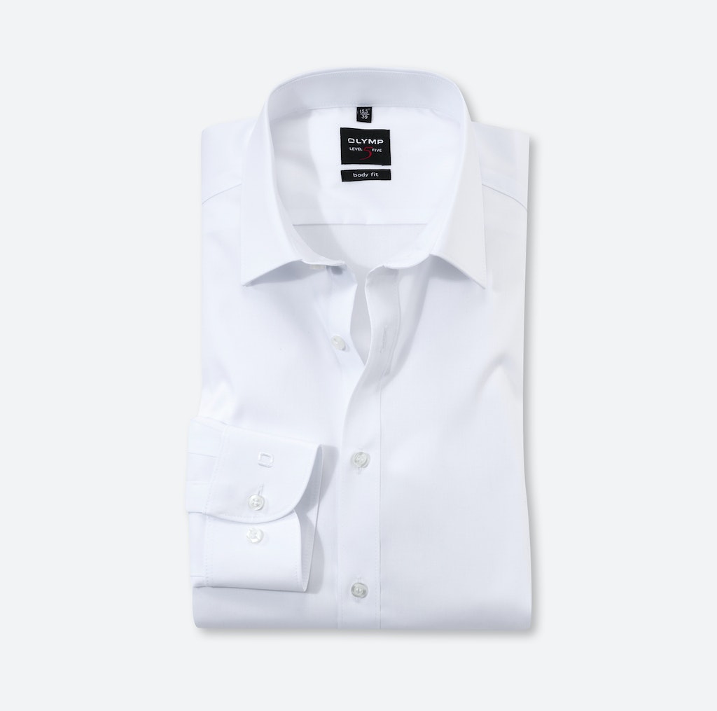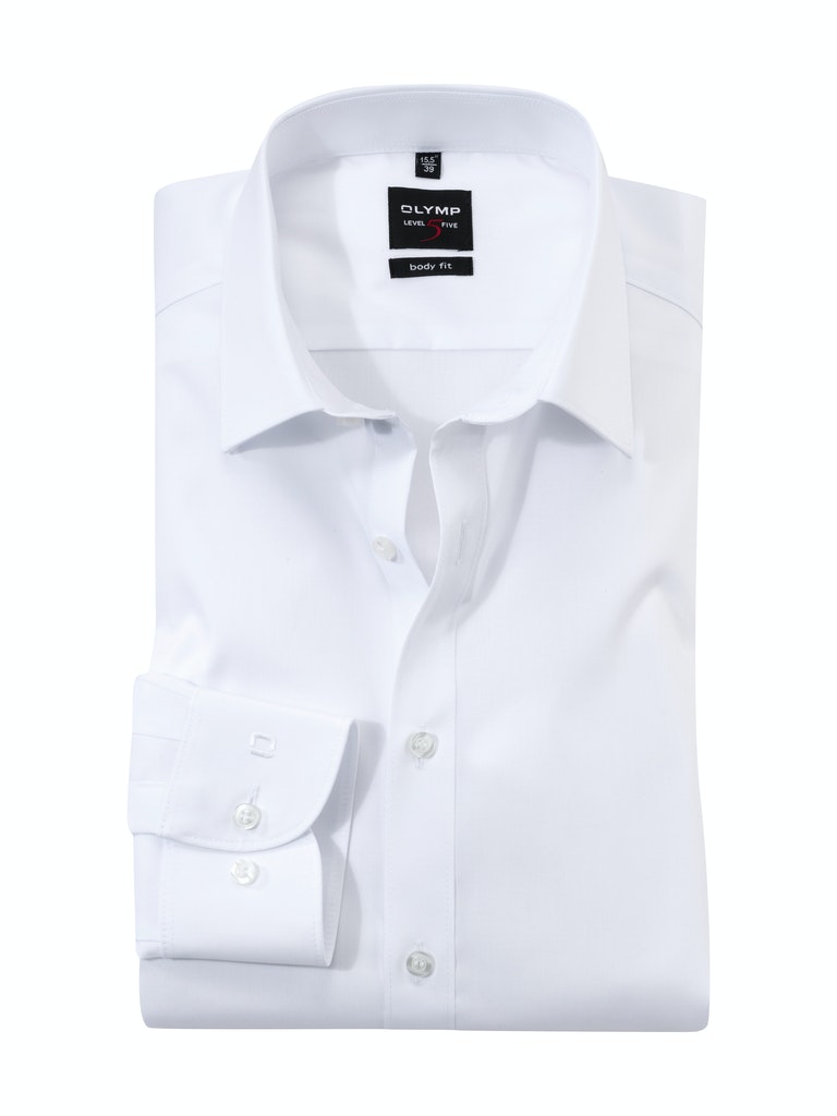 OLYMP Level Five ist das Businesshemd für den schlanken, modebewussten Mann. körperbetonte Schnittführung in Kombination mit modischen Produktdetails. OLYMP Level Five Hemden sind besonders bügelleicht und garantieren einen modisch-souveränen Auftritt. Das unifarbene Weiße Hemd ist ein wahrer Klassiker und kann mit dem eleganten New-York-Kent-Kragen zu jedem Anlass getragen werden. Die taillierte Body-fit-Passform sorgt für grenzenlose Bewegungsfreiheit dank Comfort Stretch.