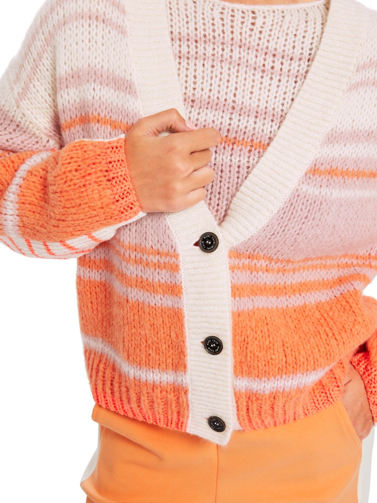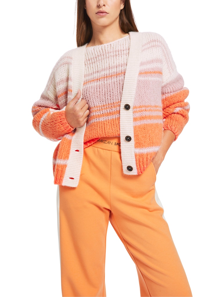 Oversized Cardigan Knitted in Germany|Oversized Strick-Cardigan. Das Design erinnert an den Bauhaus-Stil: Verschiedene Farben, Streifen und Garntypen verschmelzen zu einer effektvollen Collage. Die Front ist in haarigem Garn gestrickt, der Rücken in glattem. Der Cardigan ist Knitted in Germany: Er wird mit modernsten Technologien in Deutschland gestrickt und veredelt. Die einzelnen Teile - wie Rücken- und Vorderteil etc. - werden in europäischen Partnerbetrieben zusammengenäht.|Oversized|Knitted in Germany|V-Ausschnitt|Details in Rippstrick|Das Model ist 179 cm groß und trägt N3/38.
