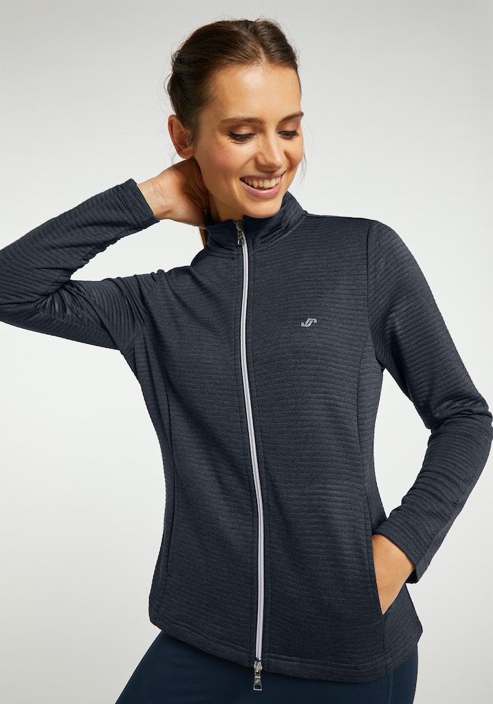 Damen-Trainingsjacke PEGGY: Zuverlässigkeit ist ihre StärkeSie sind gerne unterwegs und regelmäßige Bewegung ist Ihnen wichtig? Doch eine Damen-Trainingsjacke, die mit Ihnen mithält, haben Sie bisher noch nicht gefunden? Dann kennen Sie PEGGY von JOY sportswear noch nicht. Diese Jacke lässt Sie nämlich nicht im Stich – sei es beim Sport, in der Freizeit oder im Alltag. In der Natur schützt PEGGY Sie vor Witterungseinflüssen. Der atmungsaktive Funktionsstoff hält Wärme fest und gibt Nässe nach außen ab. Auch Windzüge hält die Langarm-Sweatshirtjacke ab. Dafür sorgen der Stehkragen sowie die Bündchen an den Armen. Eine Besonderheit dieser Trainingsjacke für Damen ist der neuartige Zwei-Wege-Reißverschluss. Er lässt sich in Nullkommanichts in beide Richtungen öffnen und schließen. Gemacht, um von Ihnen getragen zu werden Mit der Zipperjacke PEGGY fühlen Sie sich aber nicht nur beim Sport wohl in Ihrer Haut. Auch in Ihrer Freizeit sind Sie mit diesem Modell optimal angezogen. Durch ihren taillenbetonenden Sitz ist PEGGY die ideale Einkaufs- oder Ausflugsbegleiterin. In den praktischen Eingrifftaschen haben z. B. Smartphone oder Geldbeutel Platz. Und wenn im Herbst oder Frühjahr das Wet