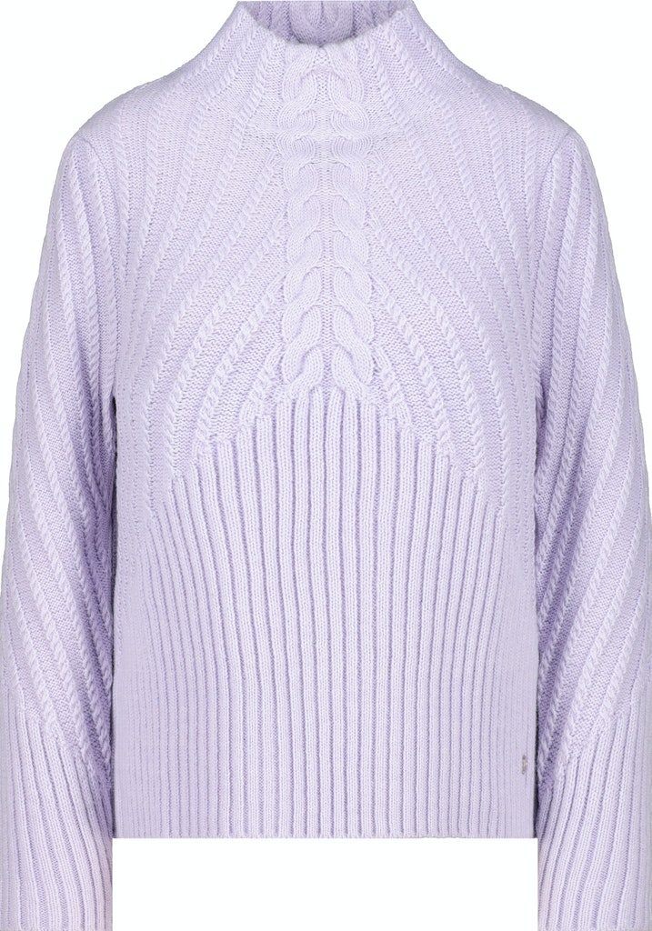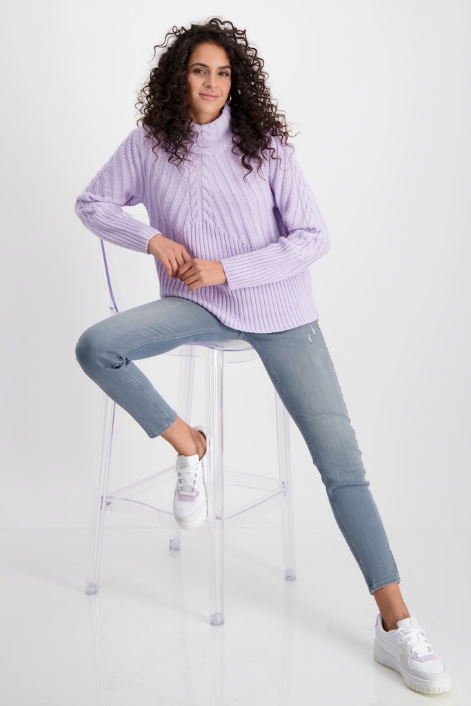 Das Zopfmuster und die Rippstruktur bei diesem wärmenden Stehkragen Pullover harmonieren stilvoll miteinander.