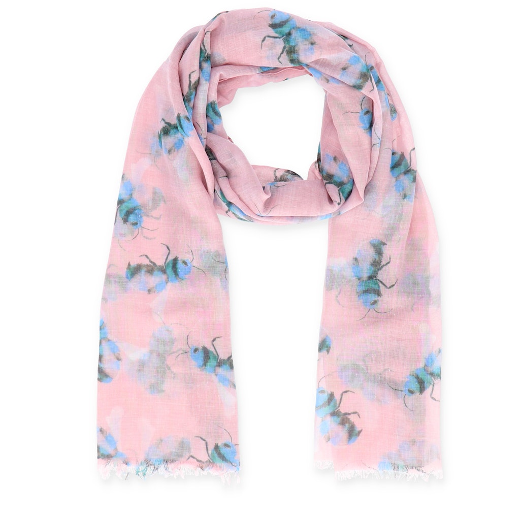 Wer ist hier die Königin? Dieser schöne Schal mit Bienenmotiven in frühlingshaften Farben, verzaubert sicher nicht nur uns! Er ist leicht und angenehm zu tragen und verleiht jedem Outfit das gewisse Etwas. Der perfekte Begleiter durch die warme Jahreszeit! - Druckschal mit Bienenmotiven - Kurze Schnittfransen - Luftig leicht - 70 x 180 cm - 100% Viskose